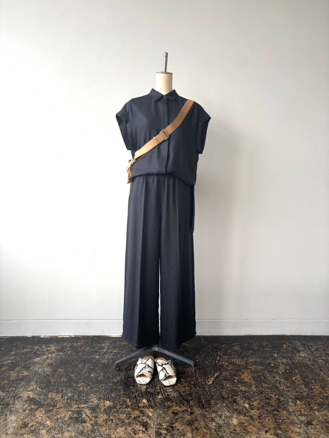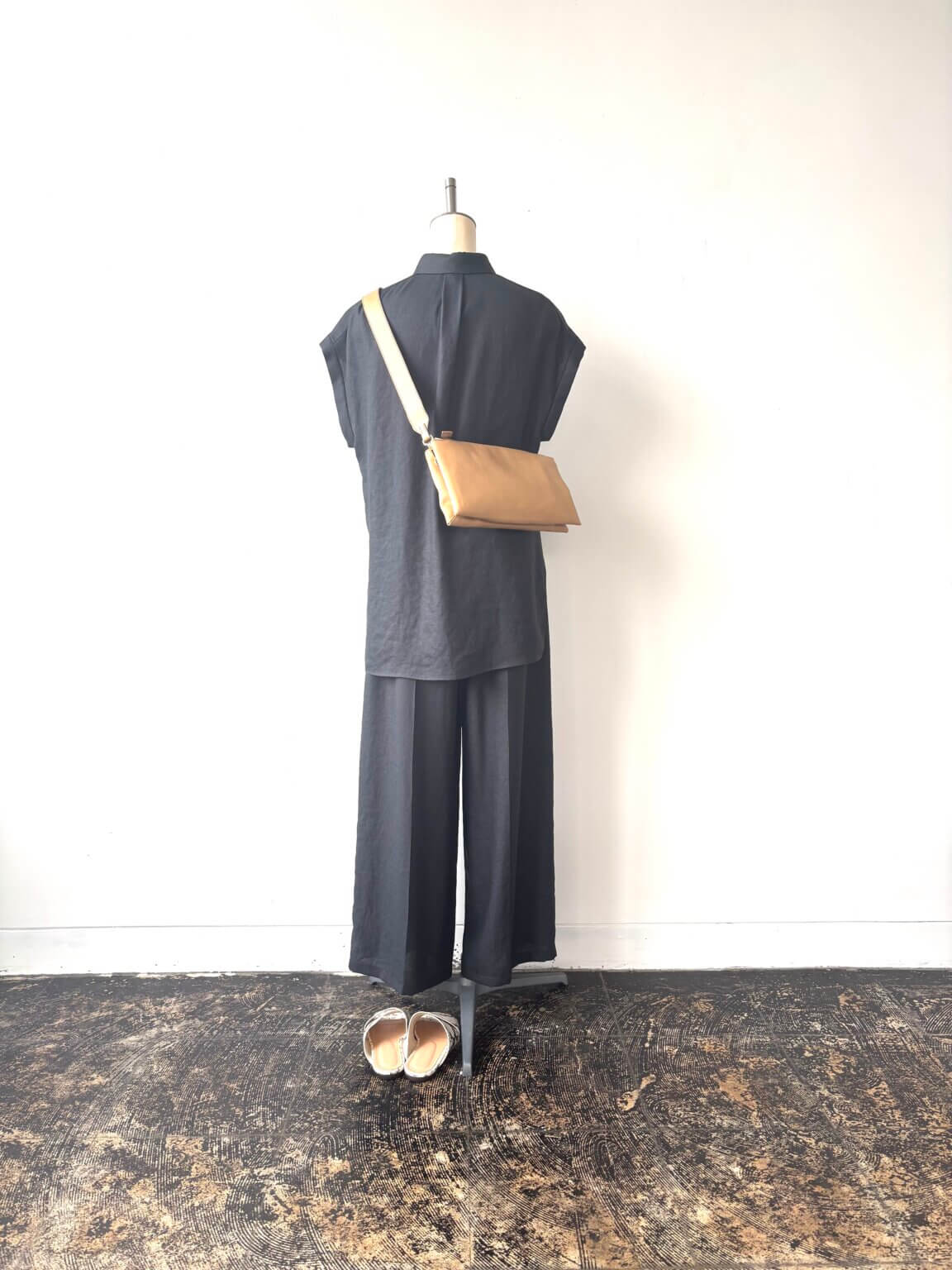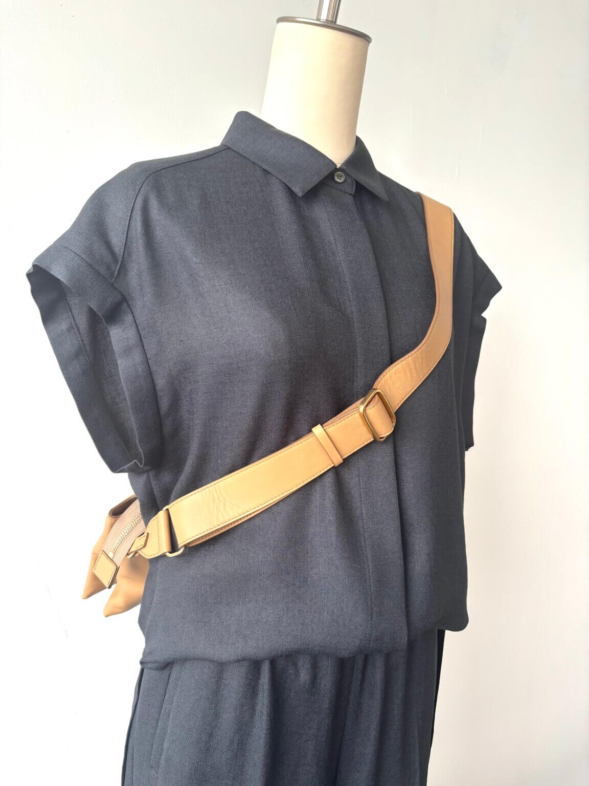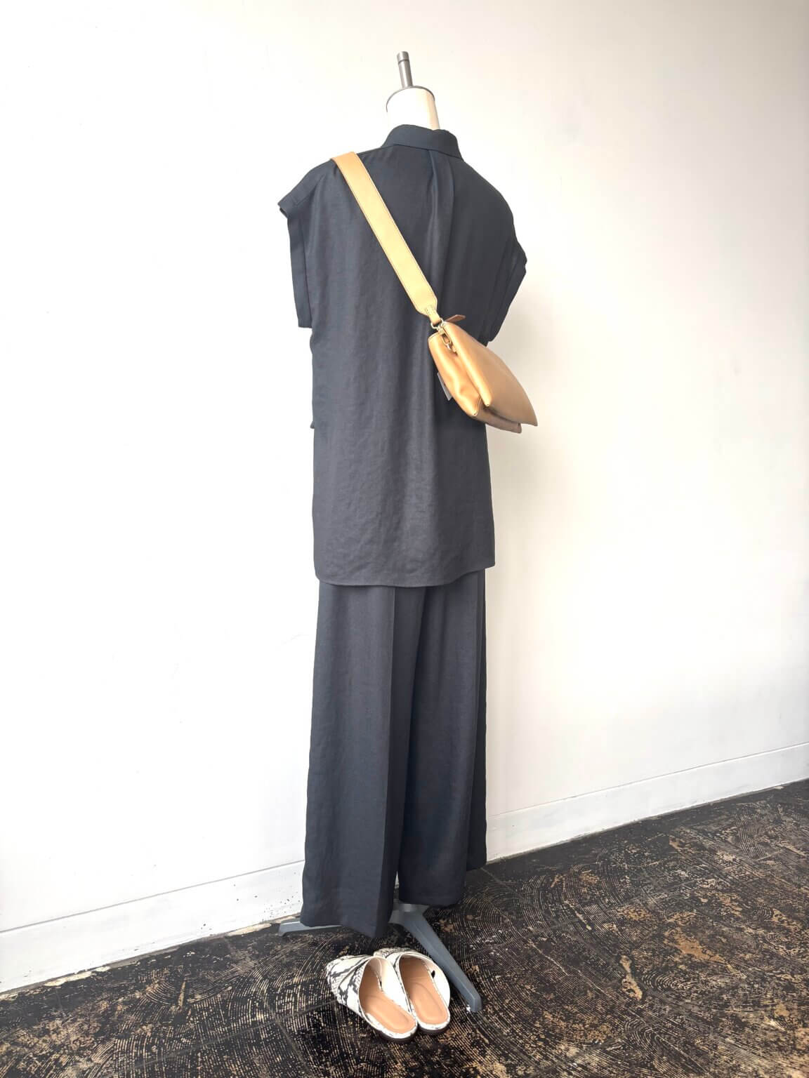 濃いグレーのセットアップで初秋だから少しきちんとした印象にして、レギュラーカラーのシャツデザインがTシャツと違いカッチリ!!KEY:オールレザーのボディバッグ