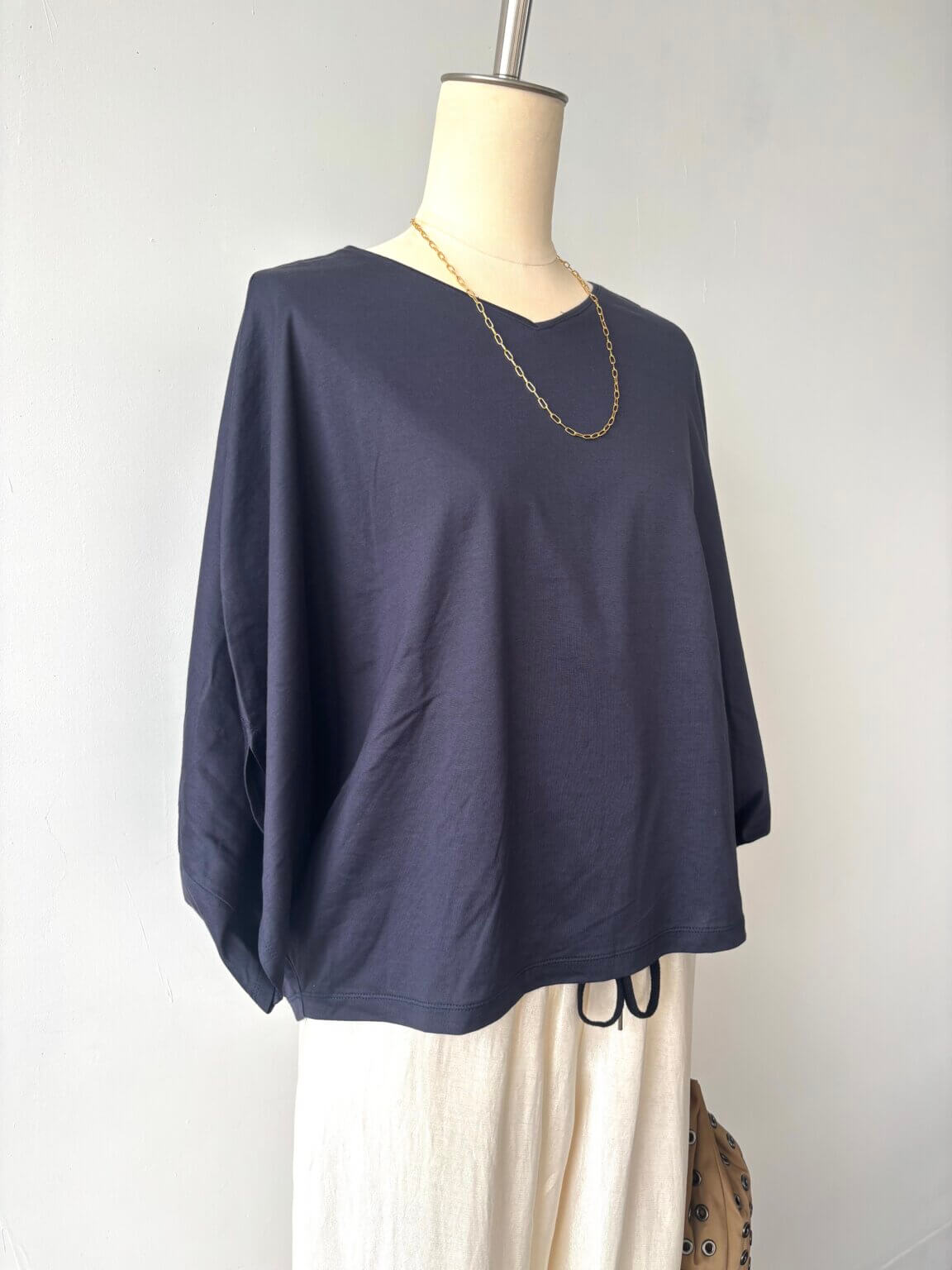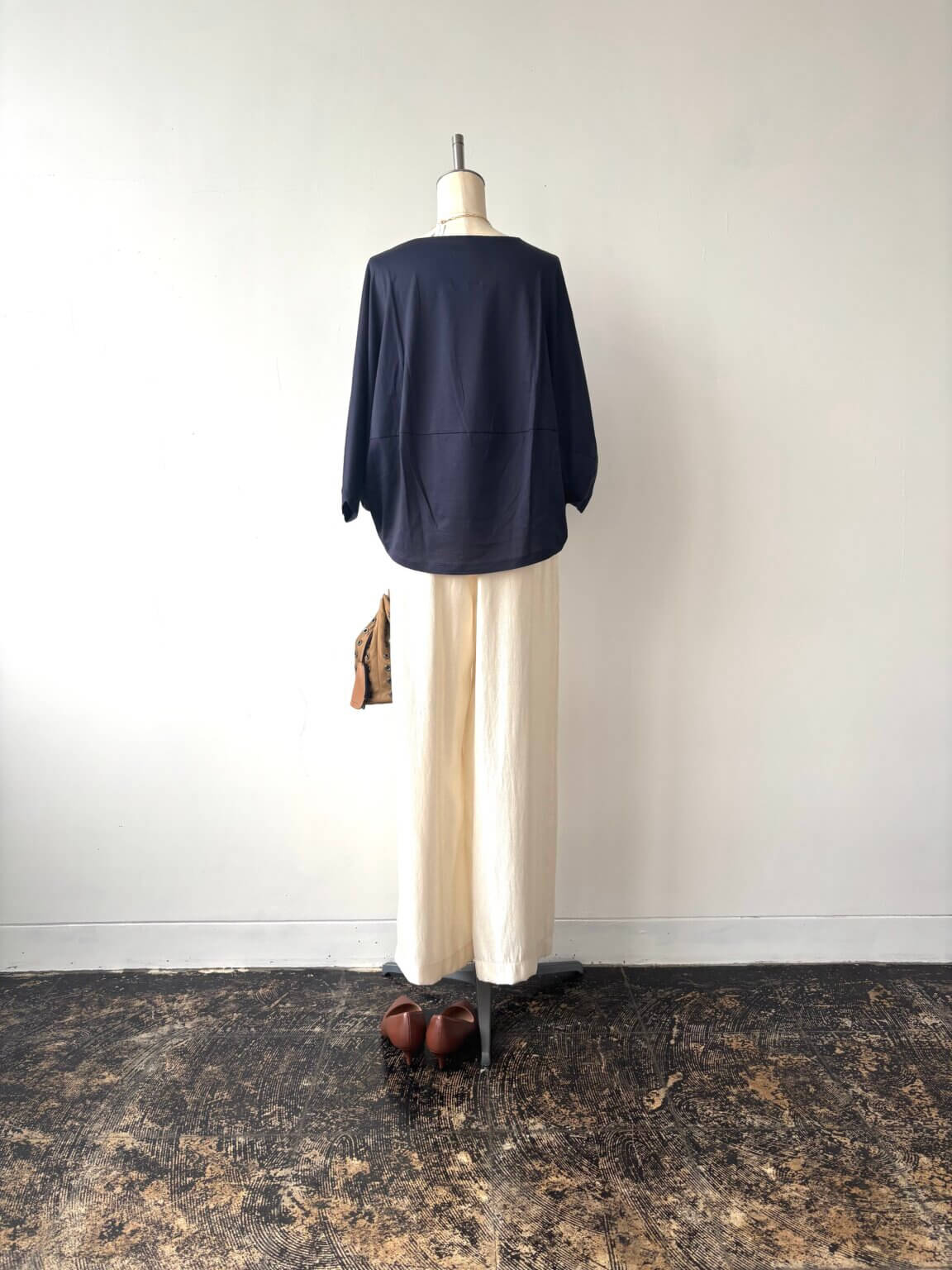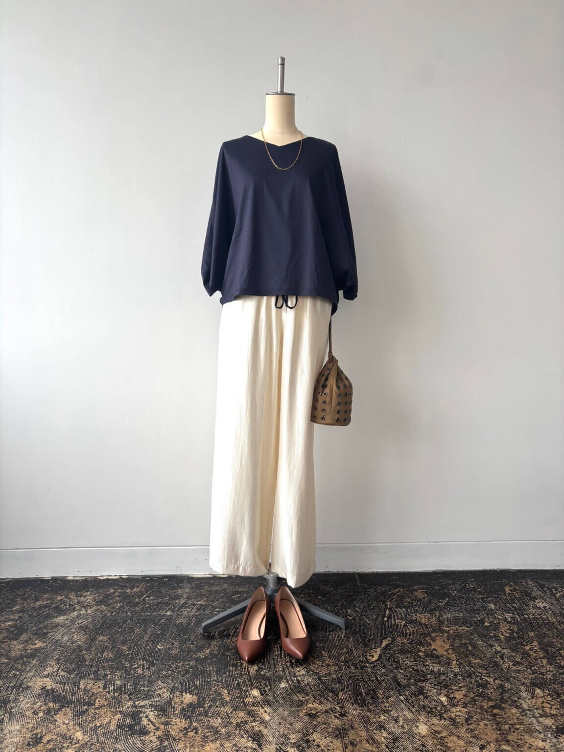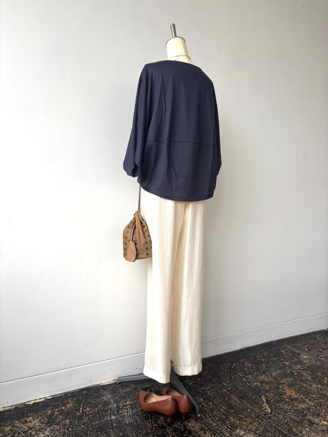 紺色でもないグレーでもない微妙な色のカットソー素材のブラウス見えするアイテムは、季節の変わり目に重宝。カジュアル過ぎずキレイ目すぎずのアイテム。KEY:ラメホワイトパンツ