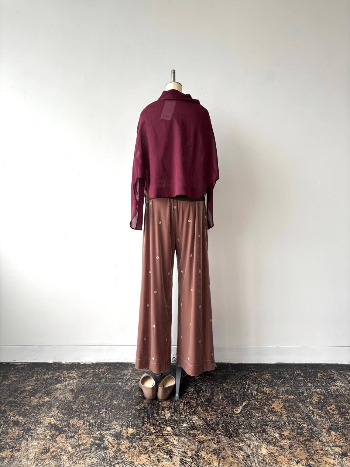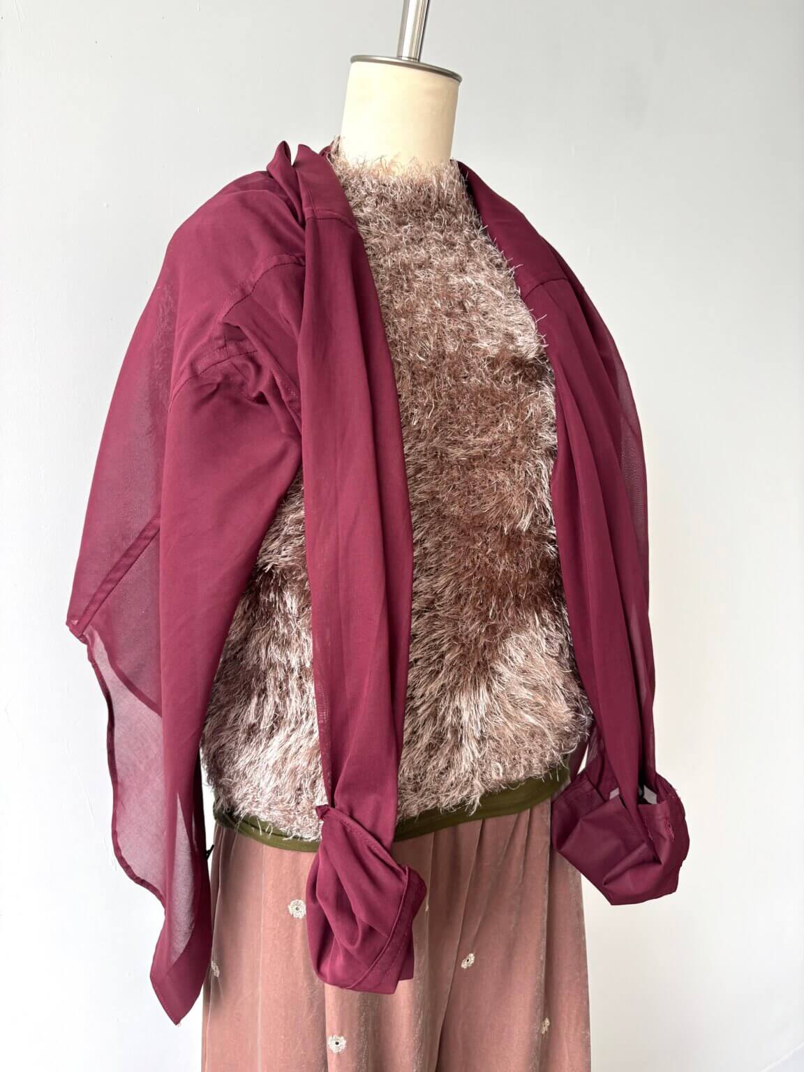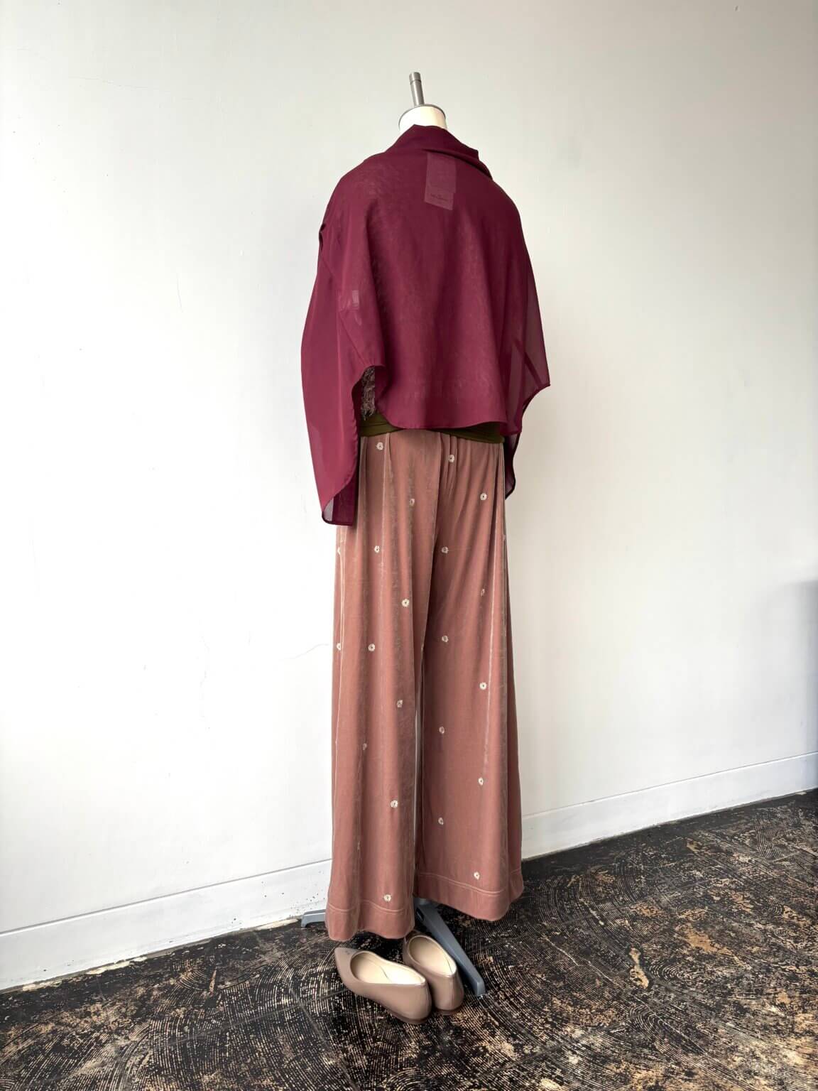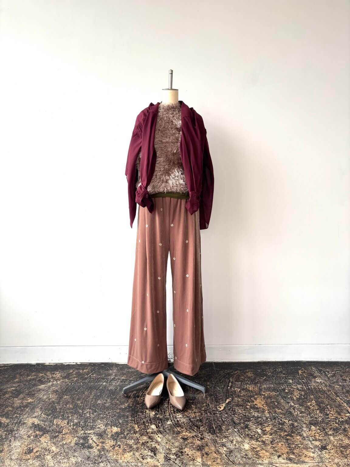 Sheer shirt ¥18700/Fluffy vest ¥12980/Velours pants ¥27500
