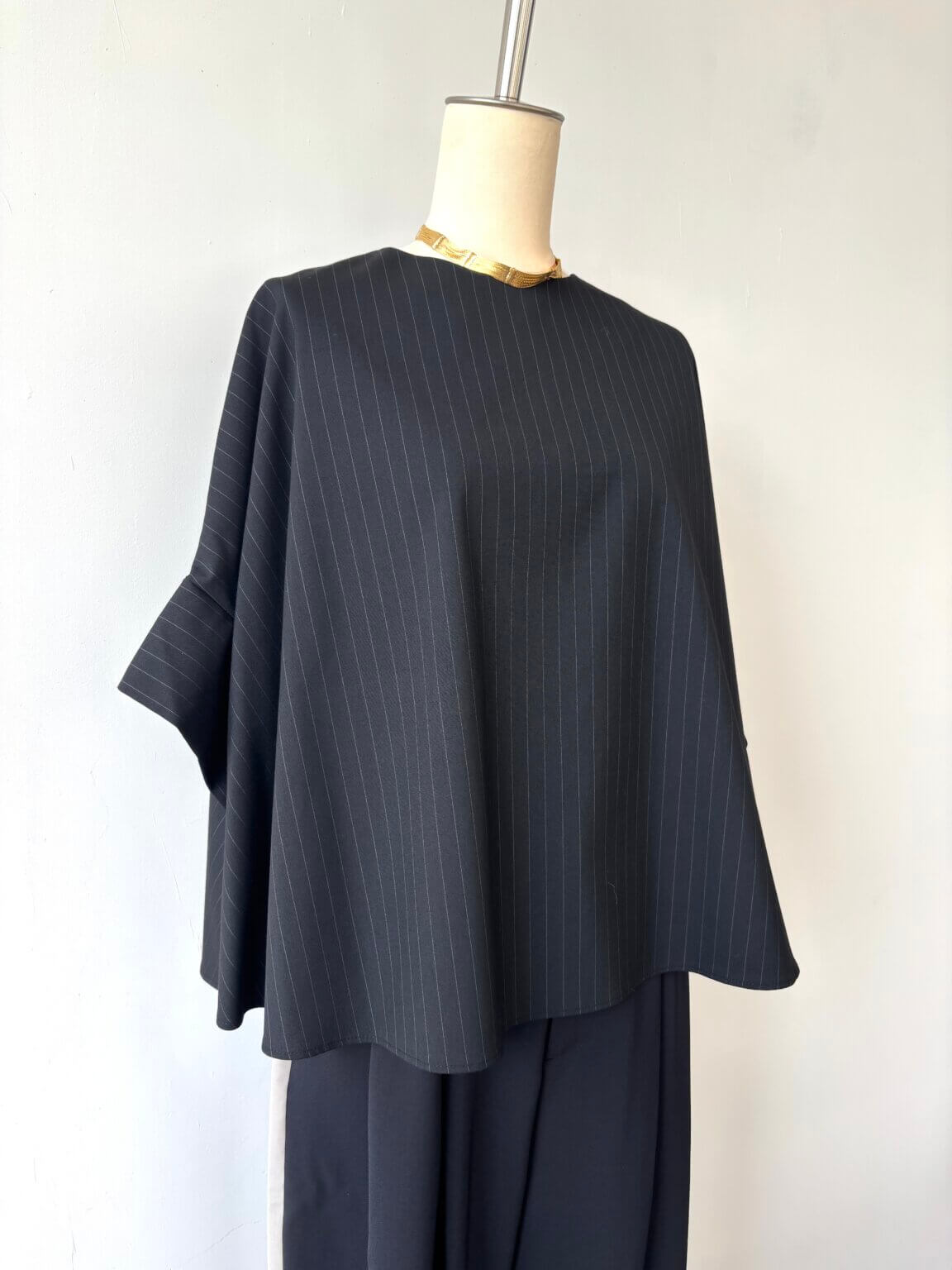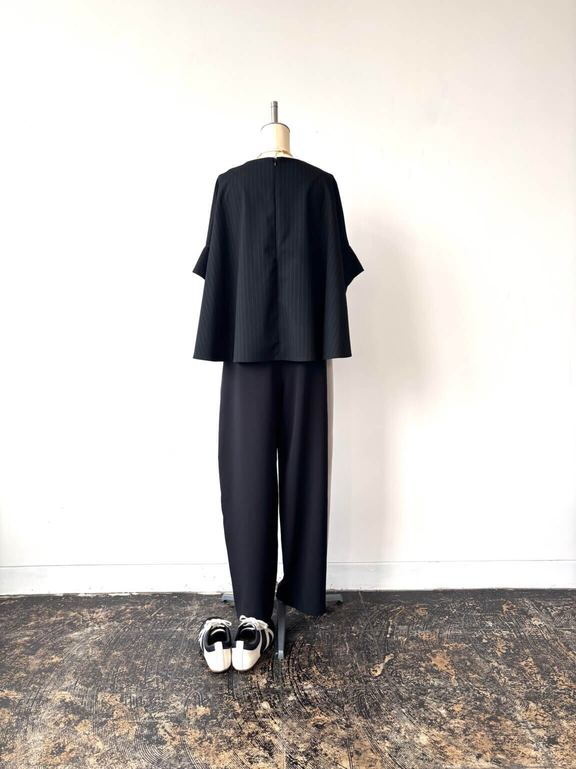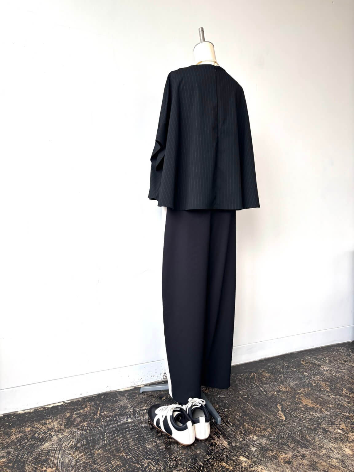この夏から秋への移行時期には濃い色を着ると季節感は浮かない。セットアップではないけど上下同色コーディネイトはスッキリ大人っぽく KEY:アイテムのシルエット