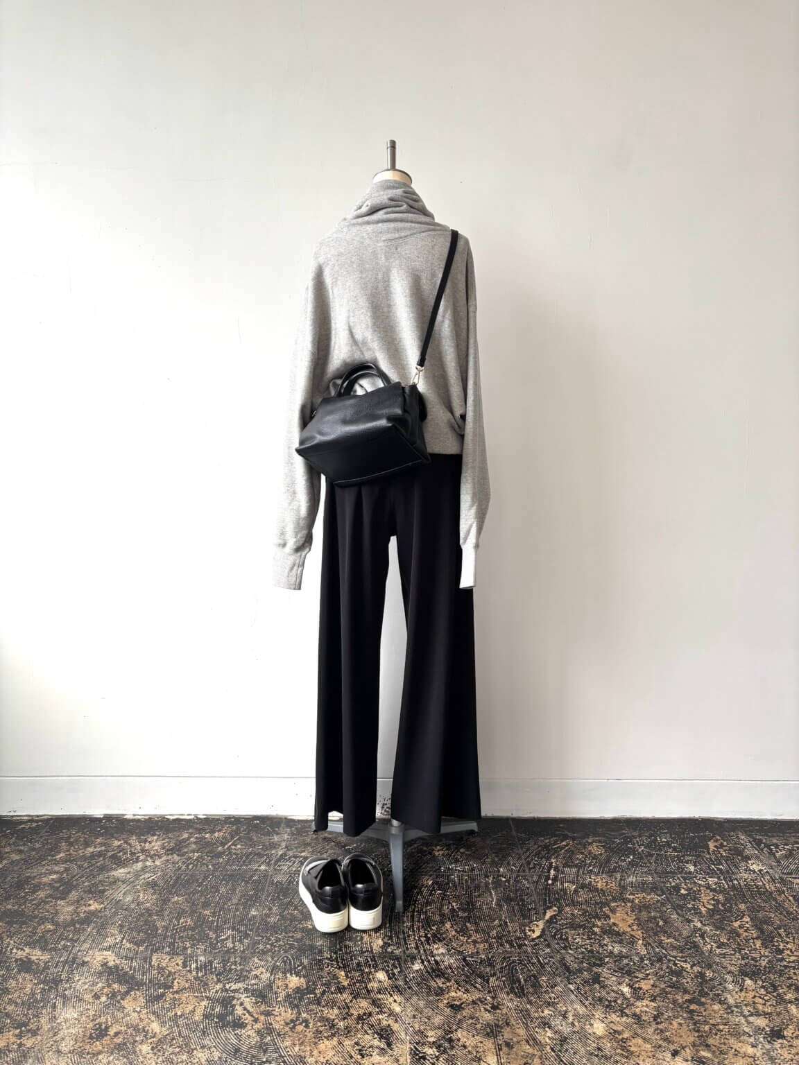 ブラックとグレースェットで誰もがしているコーディネイトなのに何がちがうの??バランスとシルエットと素材が全然ちがうのです。KEY:アイテム一つずつのディテール