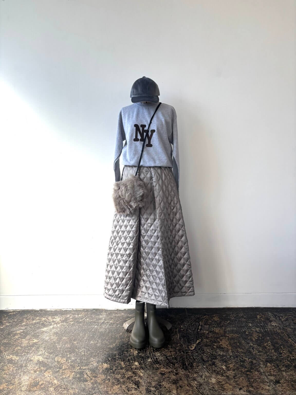 Velours cap ¥6490/Sweat ¥13200/Satin quilting skirt ¥18700/Rain boots ¥17000/Fur Bag ¥25300