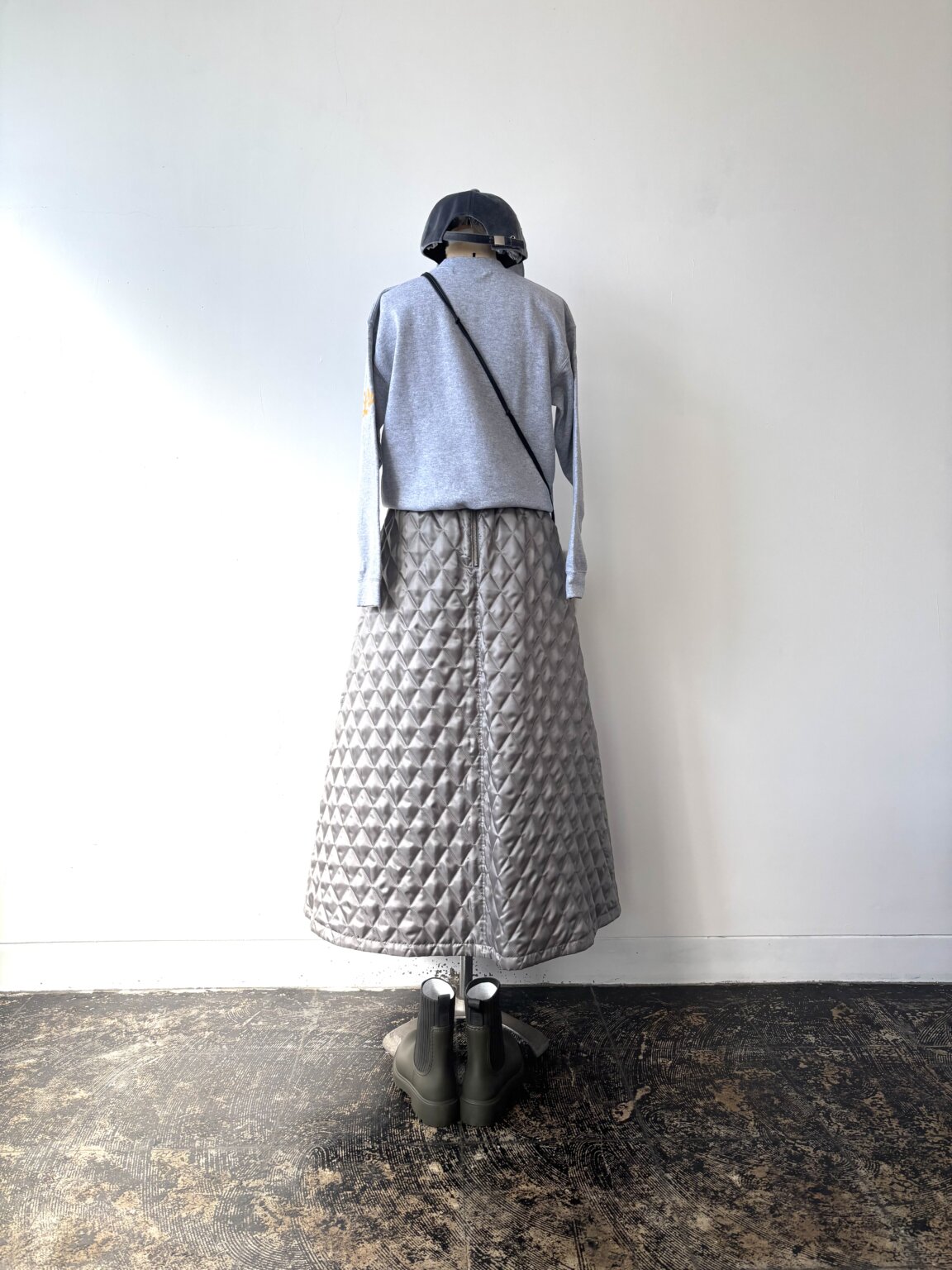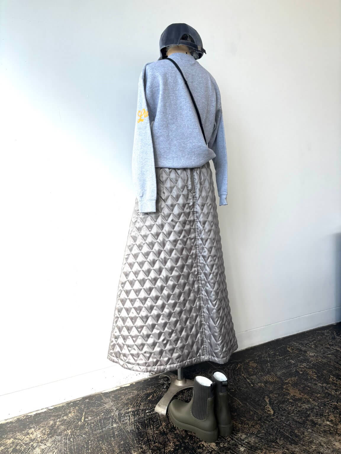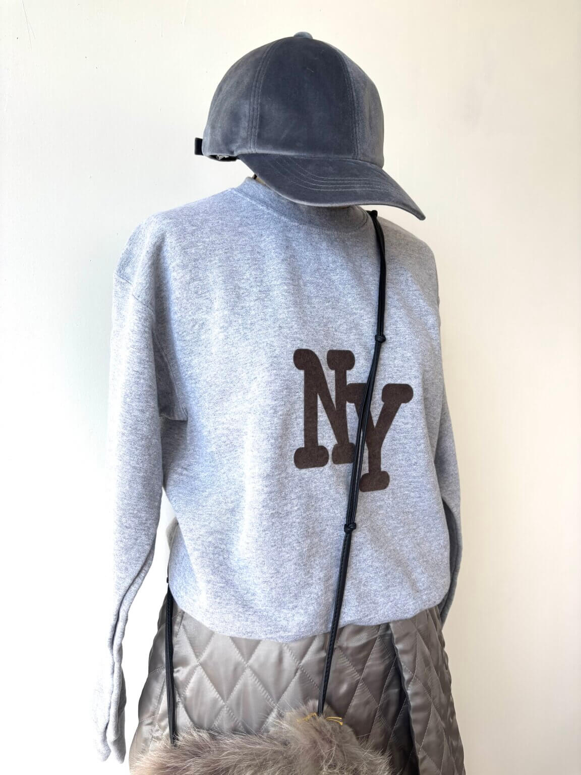 キルティングも色々あるけどスカートでリバーシブル。ロゴ入りトレーナーでカジュアルになってしまいそうだけど、大人が着るときには気をつけたいのはサイズ感!KEY:ベロアキャップ