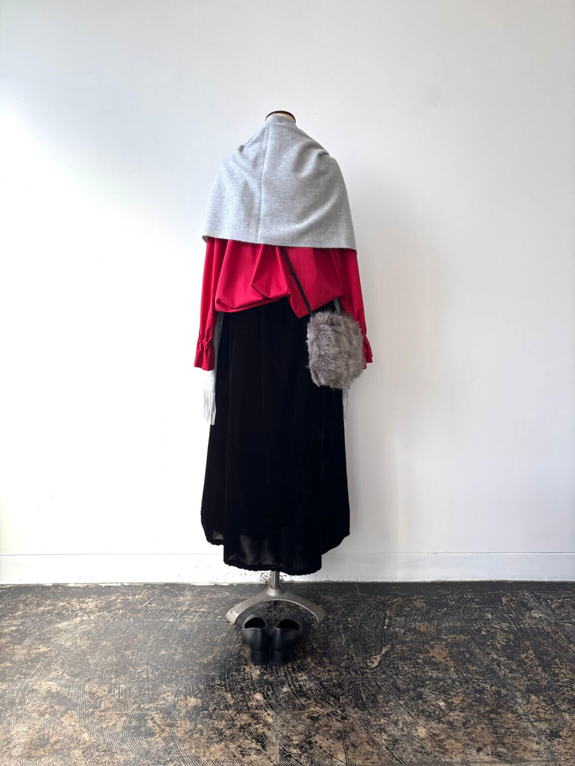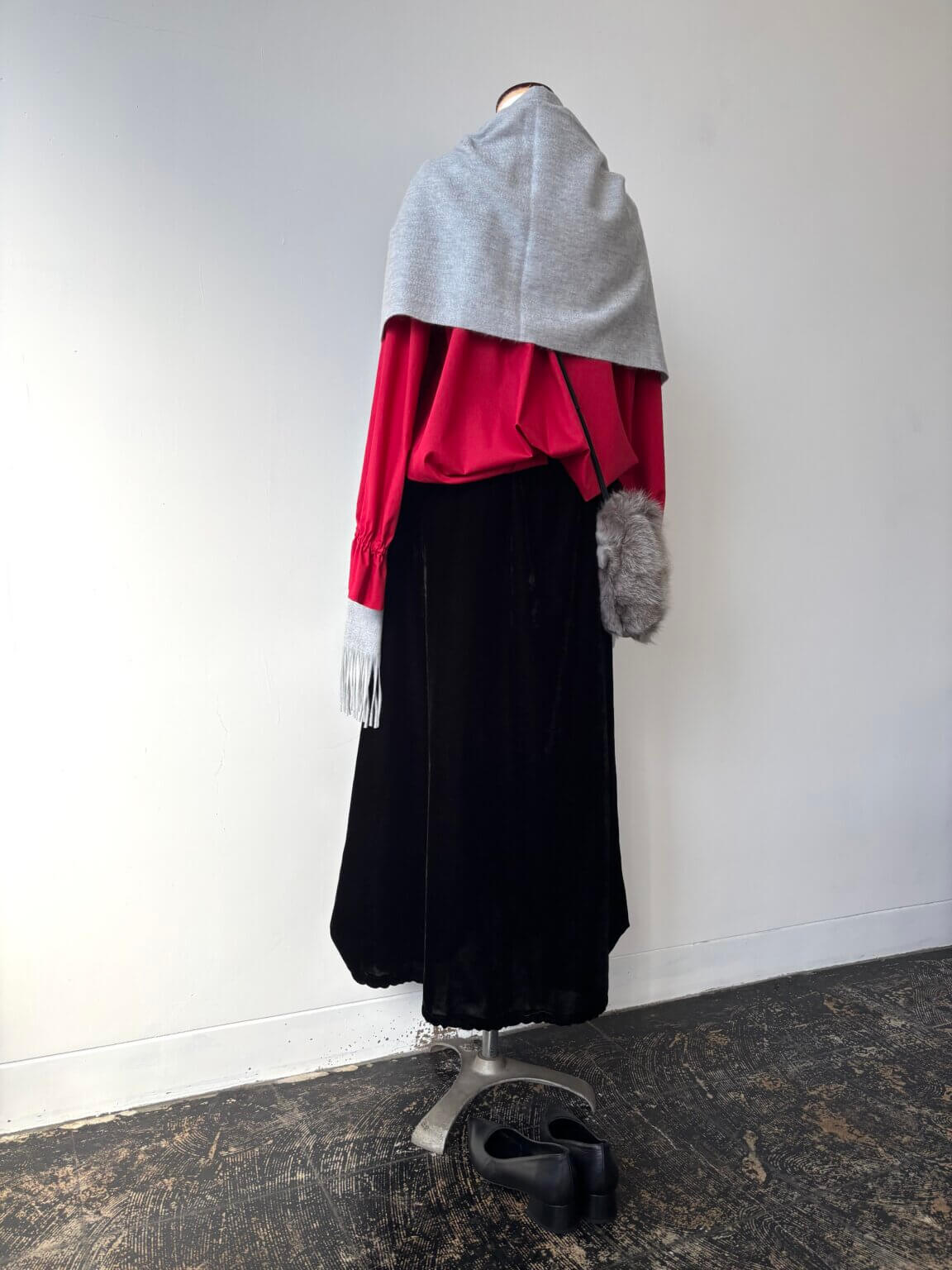 Gather neck blouse ¥19800/Velours skirt ¥30800/Fur Bag ¥25300