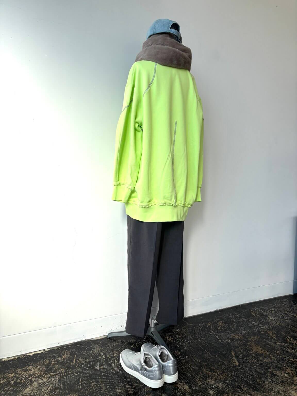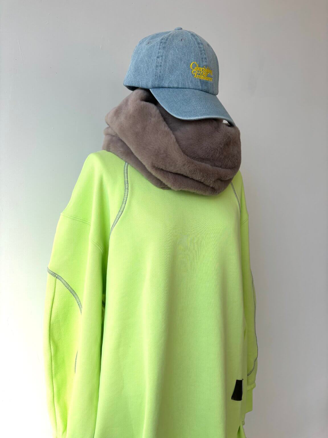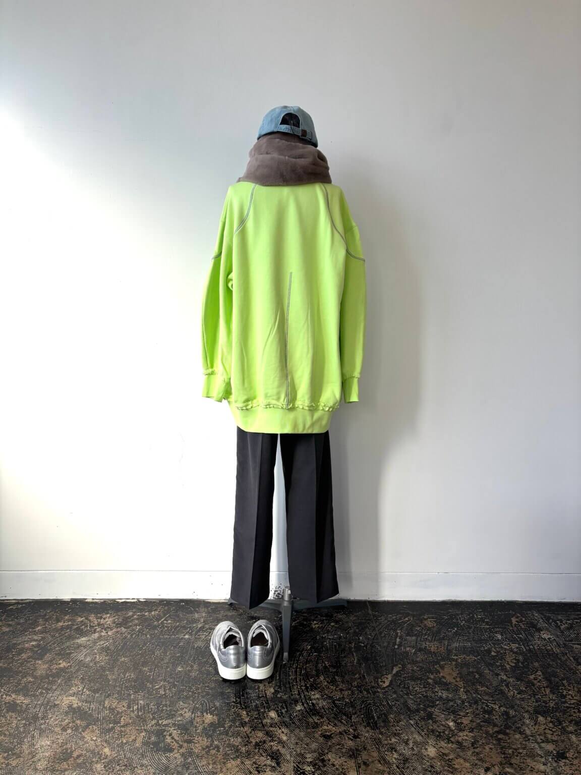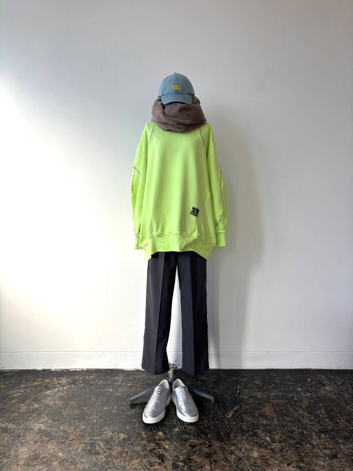 ライムグリーンのスェットメインに大人の合わせとしてはフェイクファーとエレファントグレーのカッチリ見えするパンツを 大人はカジュアル過ぎずキレイめすぎず・・・KEY:ブリーチのキャップ