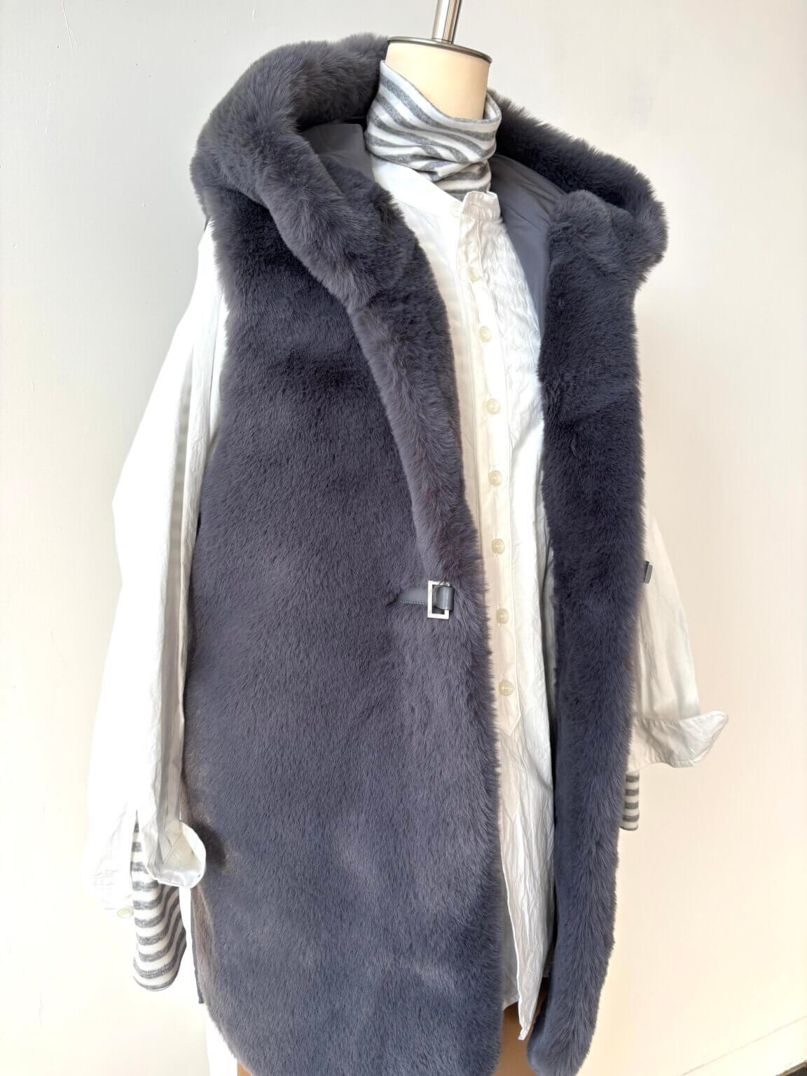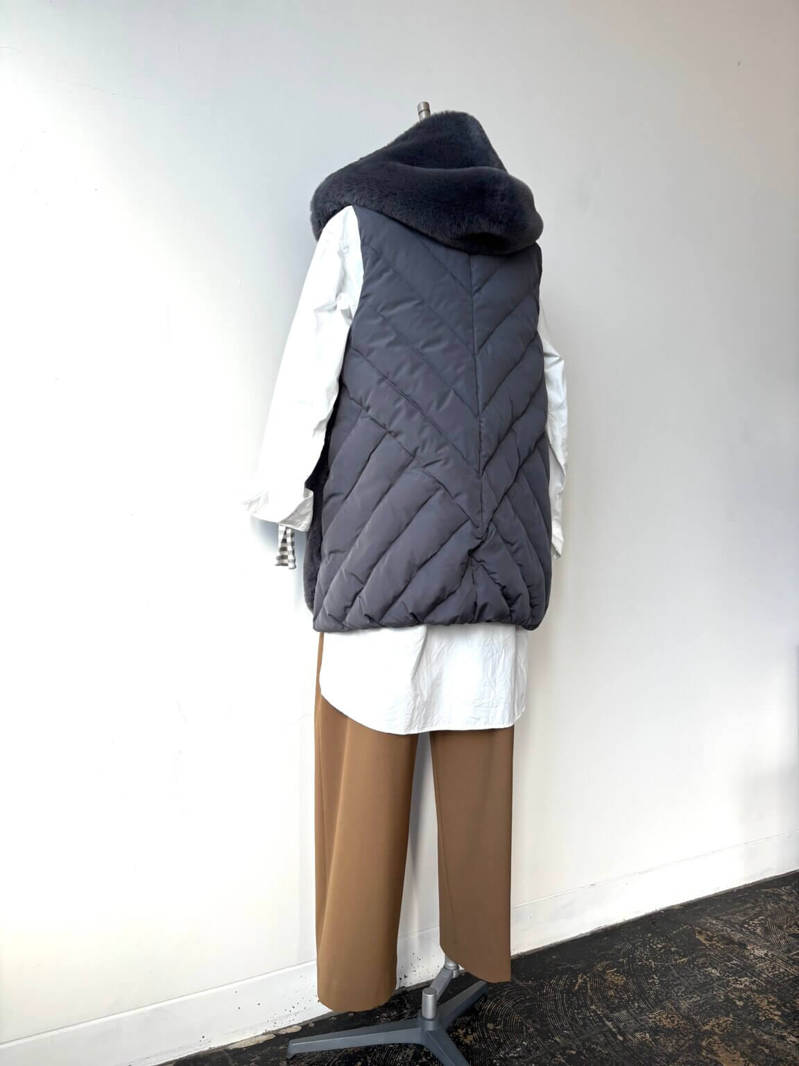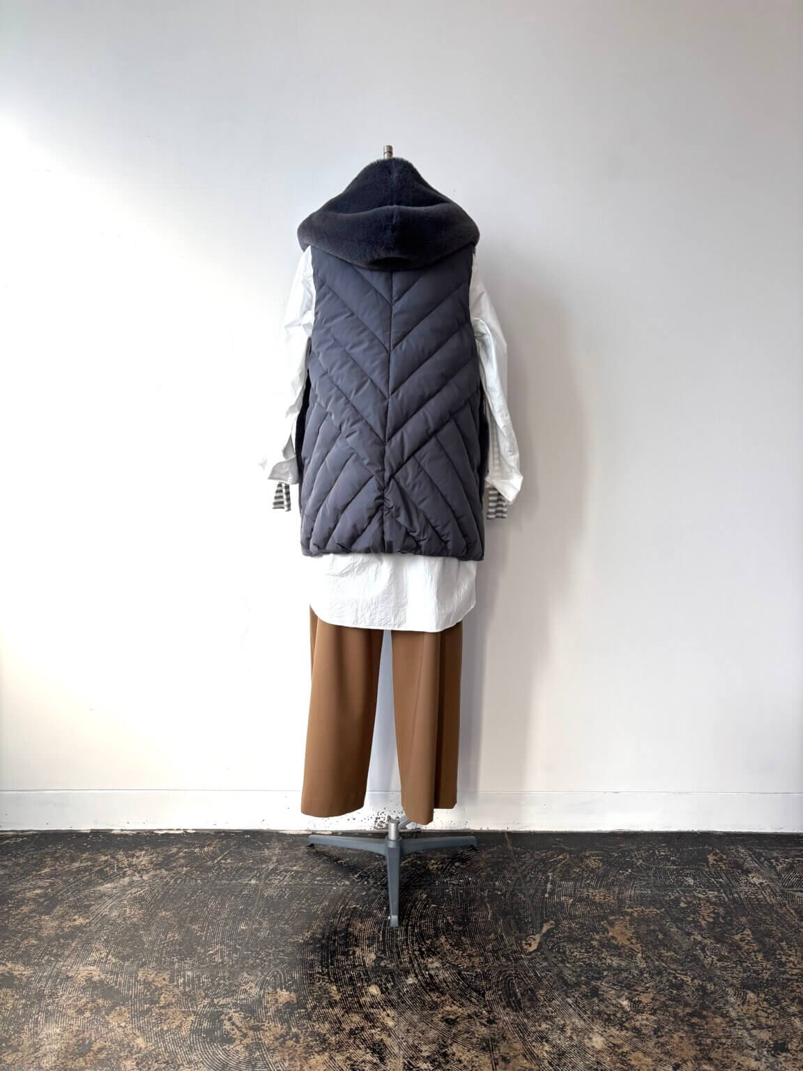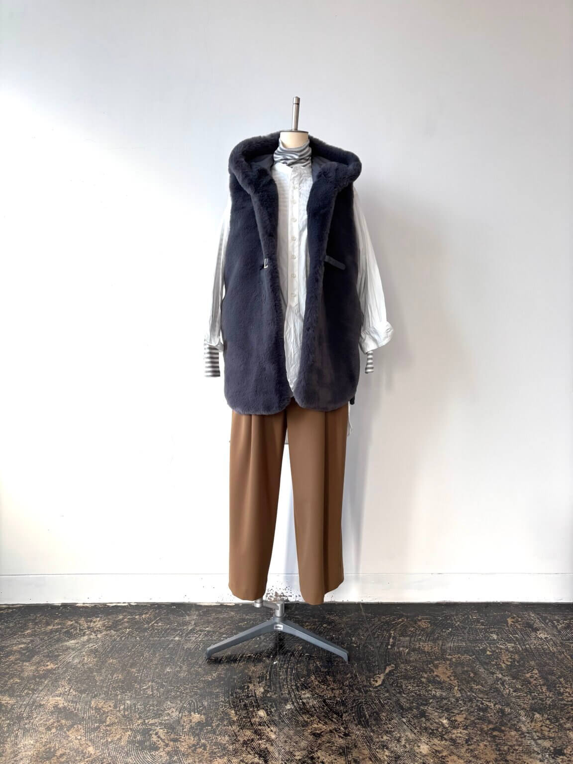 Fur vest ¥35200/No collar shirt ¥16940/Border high neck ¥12100/Pants ¥28600