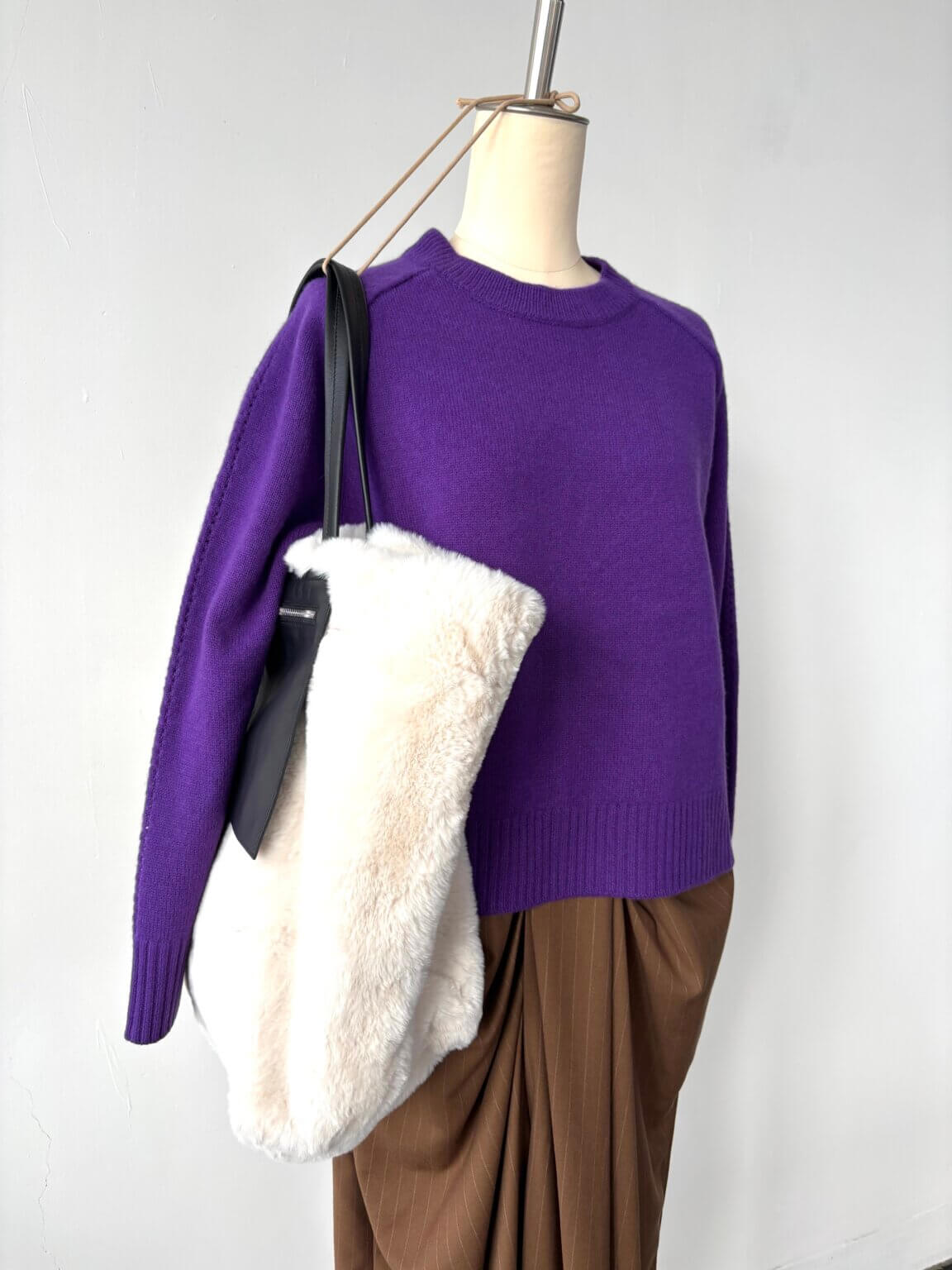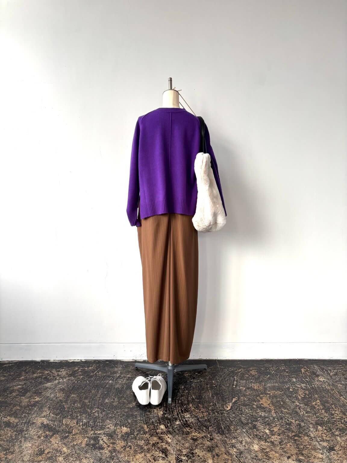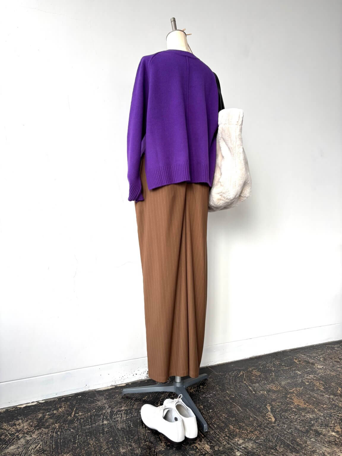 パープルは主張ある色で好みはあるかもしれないけど、キャメルと合わせてどこか懐かしいような新鮮なような色合わせでアップデート KEY:ホワイトの差し色