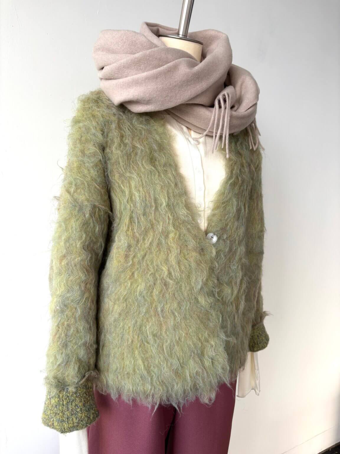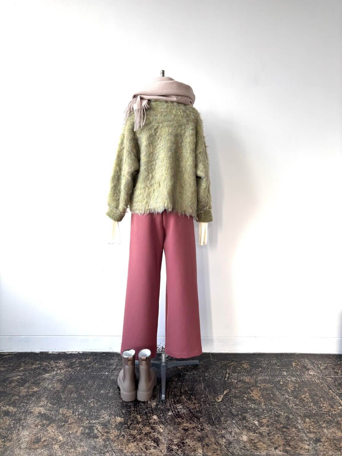 冬モノトーンや落ち着いたベーシックカラーよりちょっと新色でカラフルな冬の装いを!!ほんのすこし古着のようなニュアンスを入れてみてのコーディネイト KEY:インナーとストール