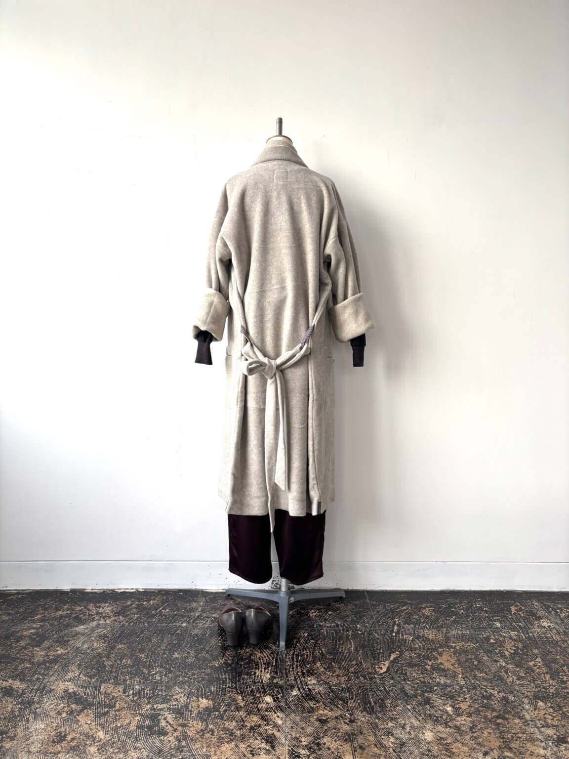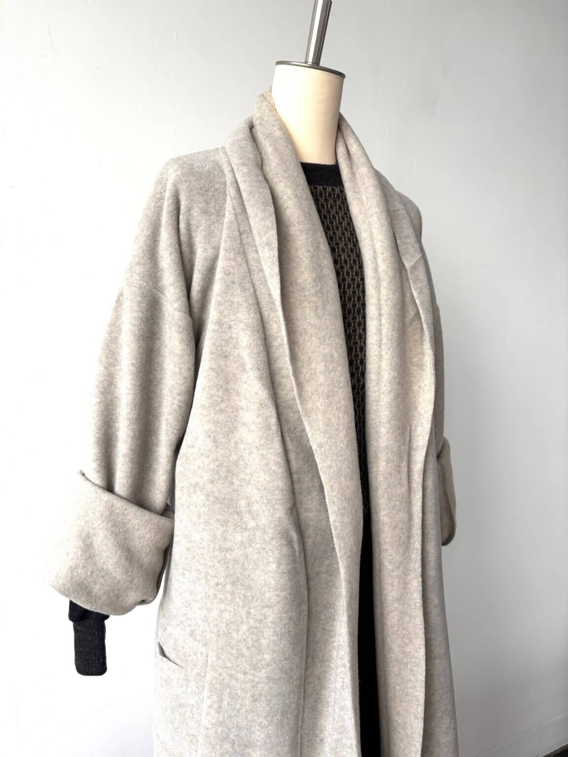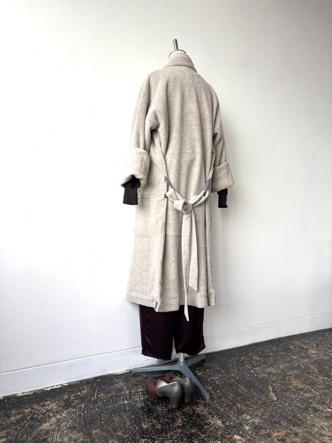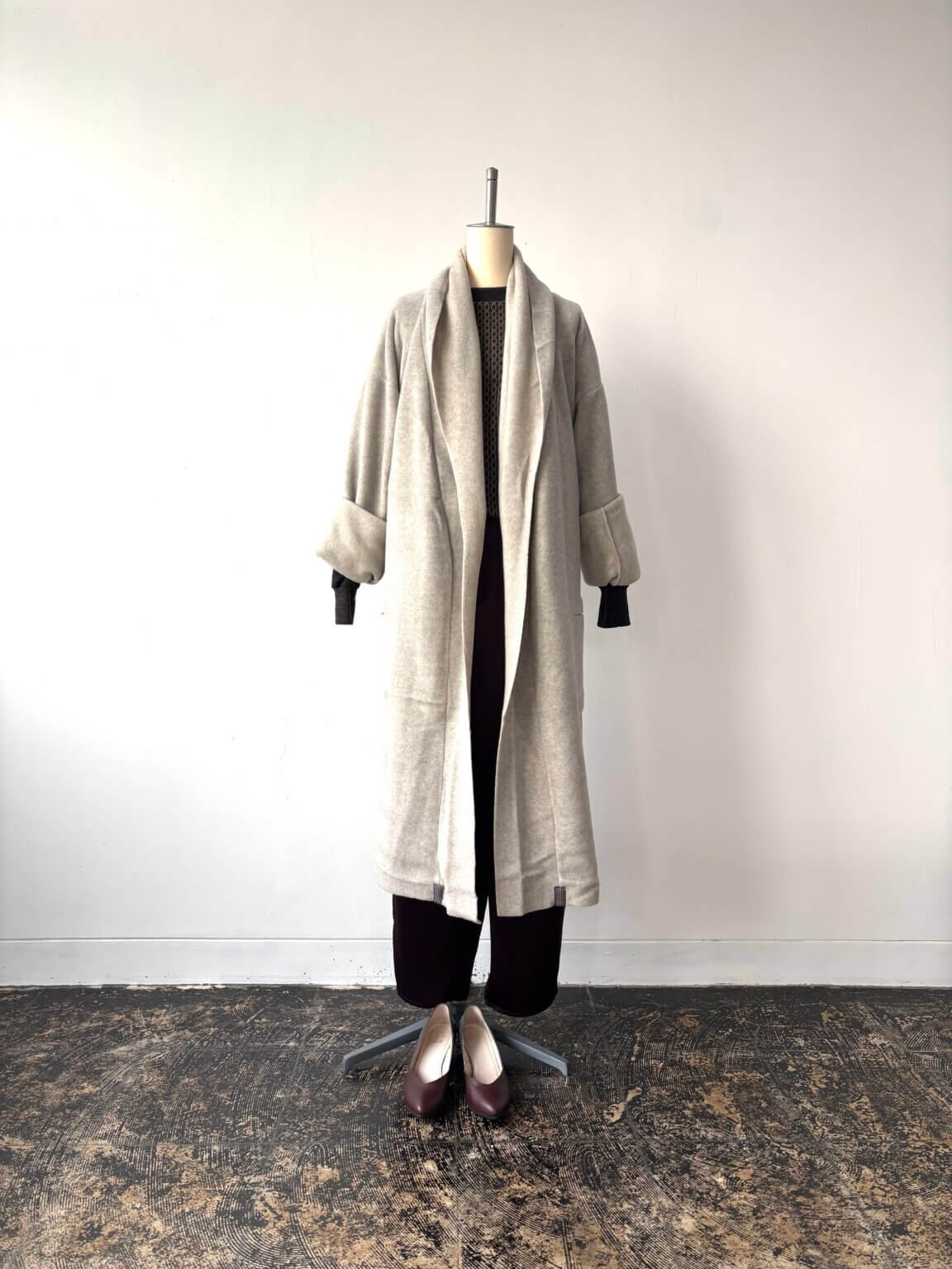 Fleece coat ¥35200/Knit ¥19800/Satin pants ¥23100/Pumps ¥35200