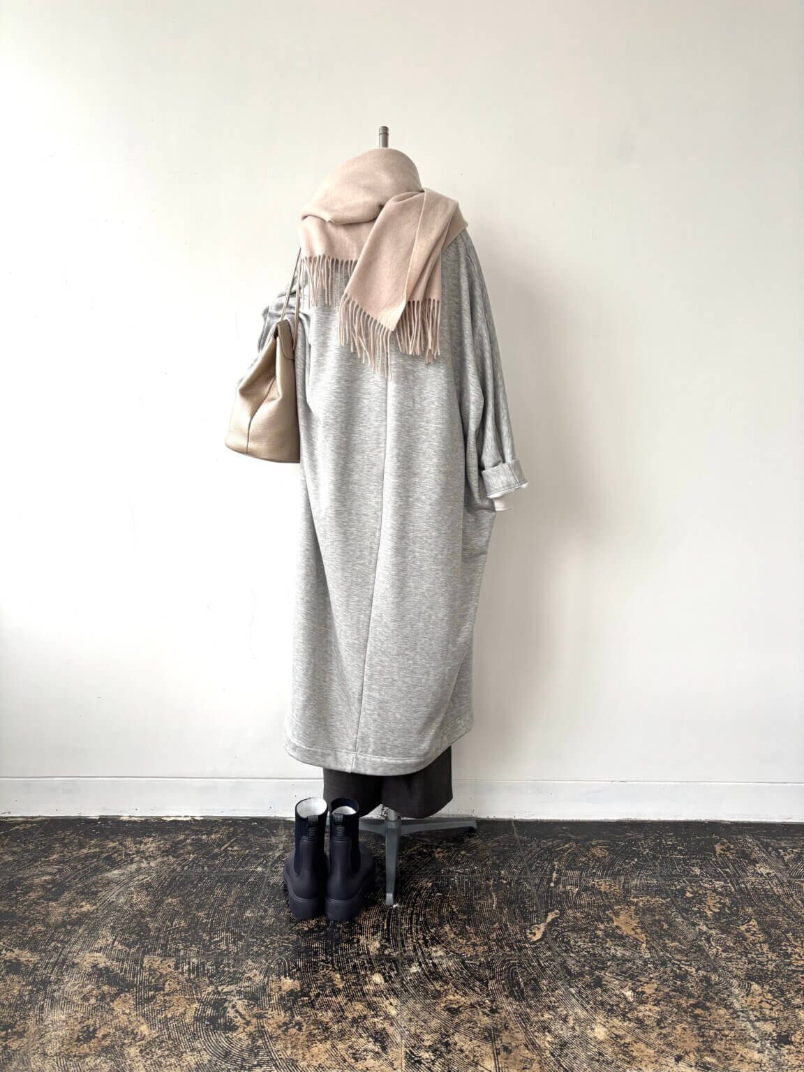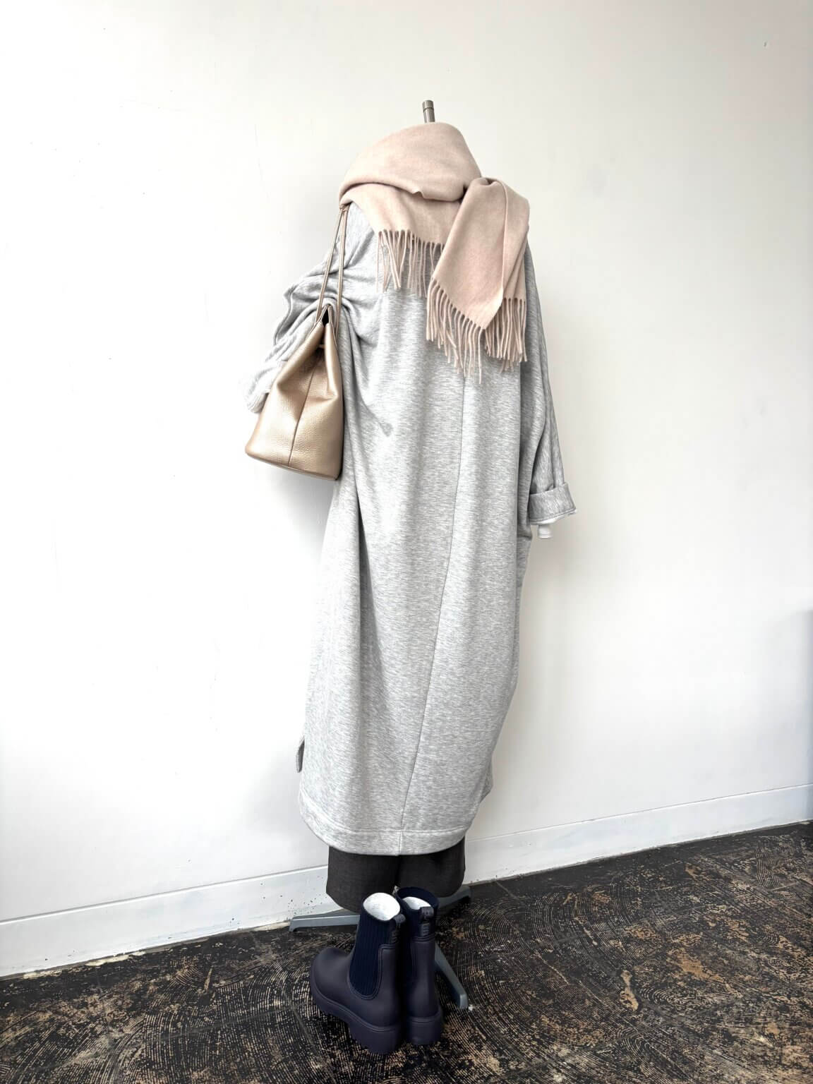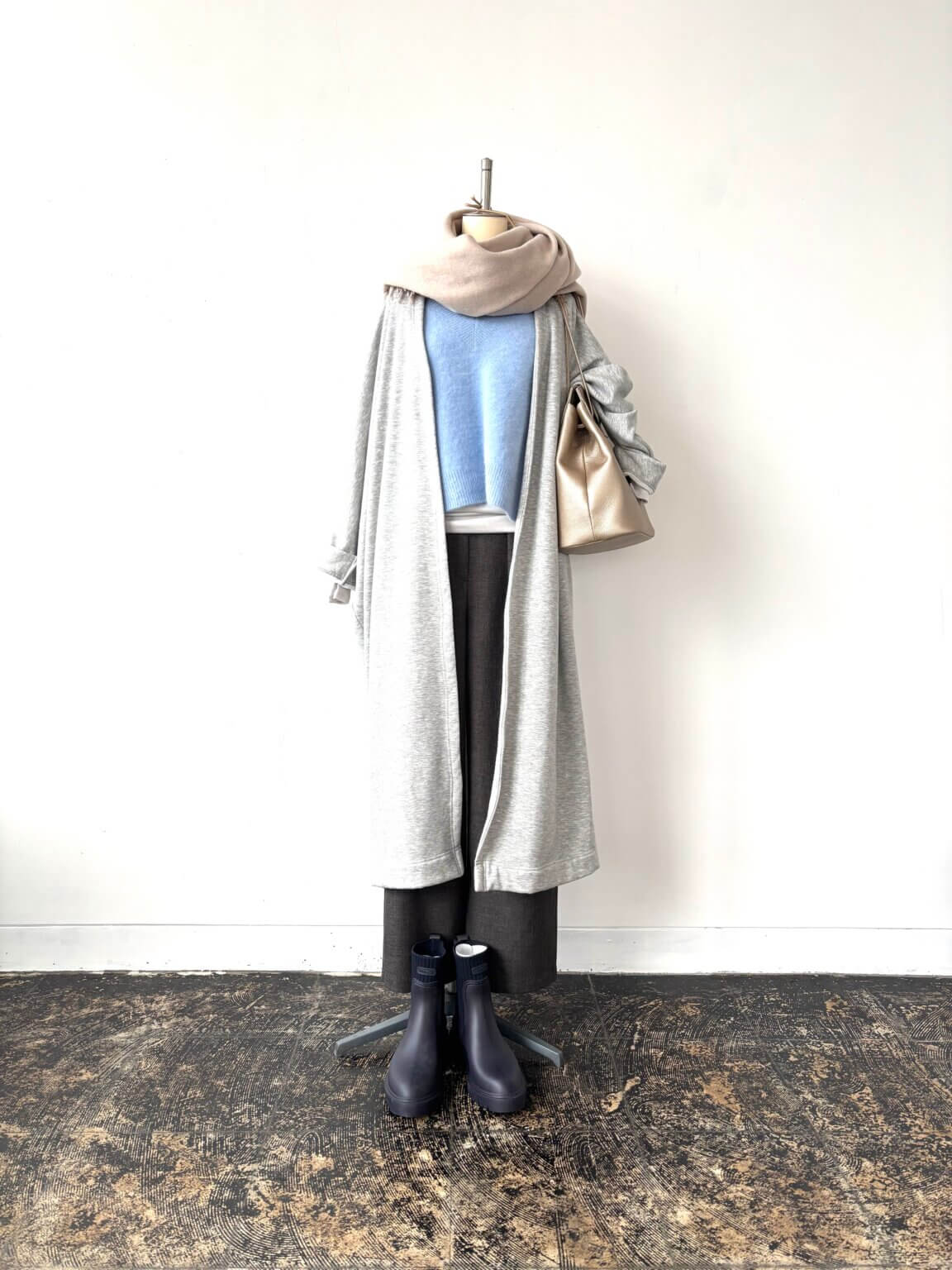 Long cardigan ¥22000/Short Knit ¥29700/Pants ¥15950/Muffler ¥9790/Rain boots ¥17000/Bag ¥29700