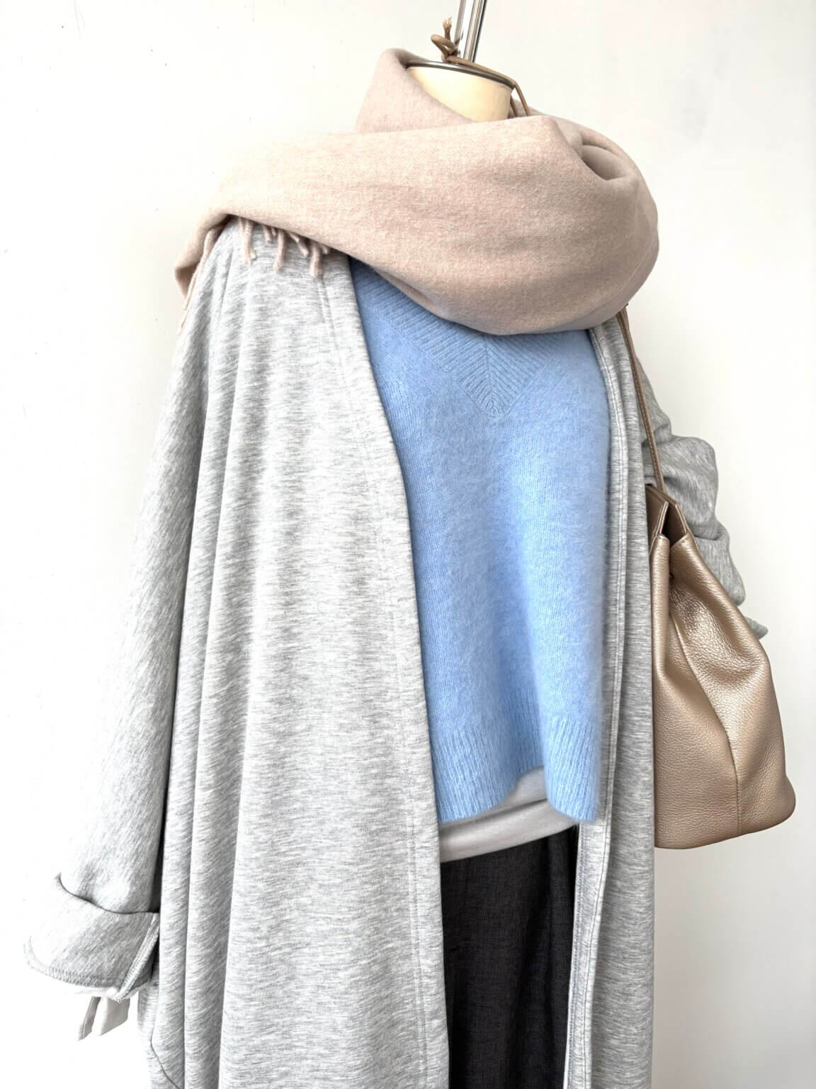 ダークブラウンとライトブルーは相性ヨシ。差し色にピンクベージュのストールやバッグで柔らかさをプラスしてアップデート KEY:小物たち