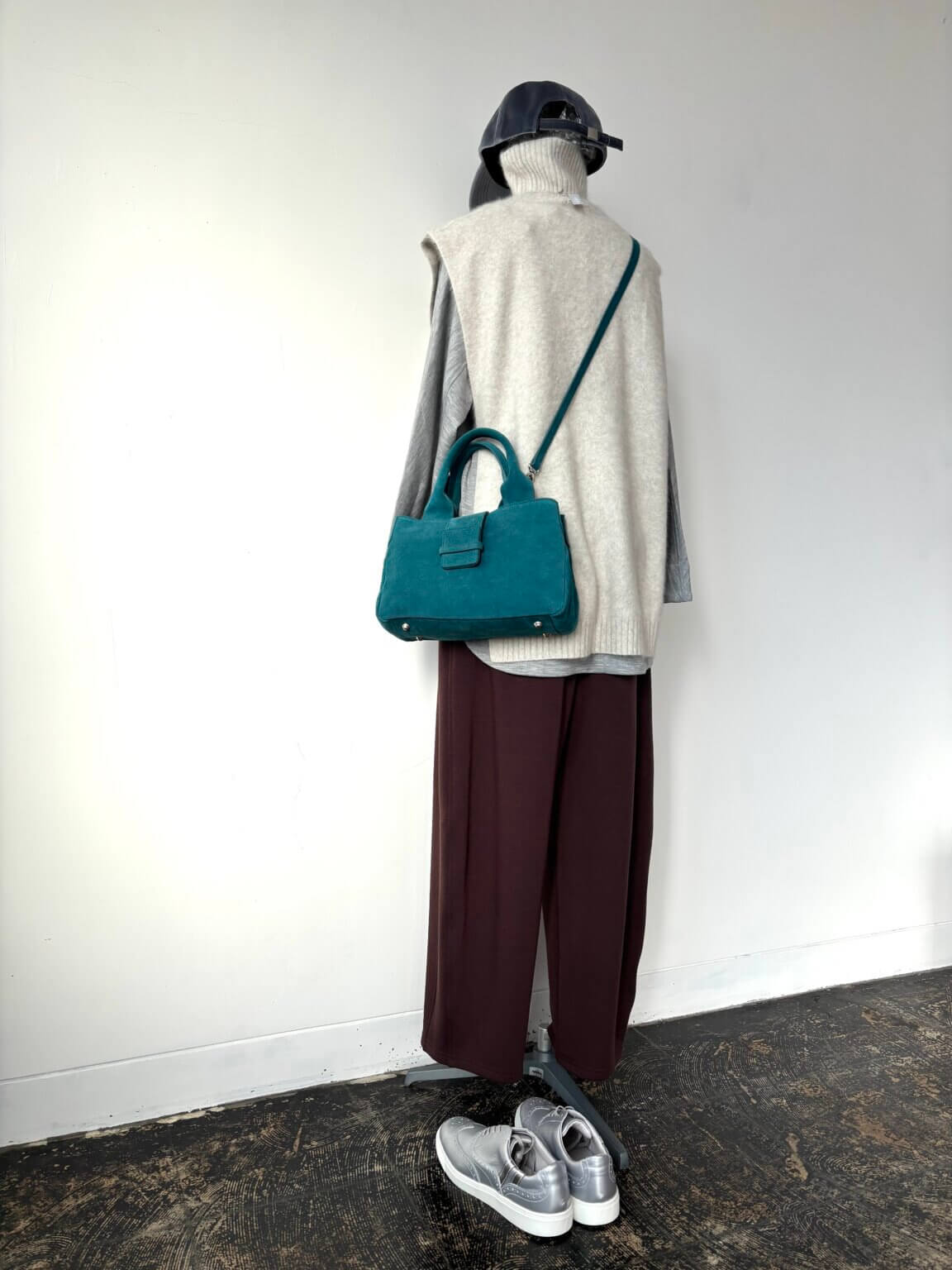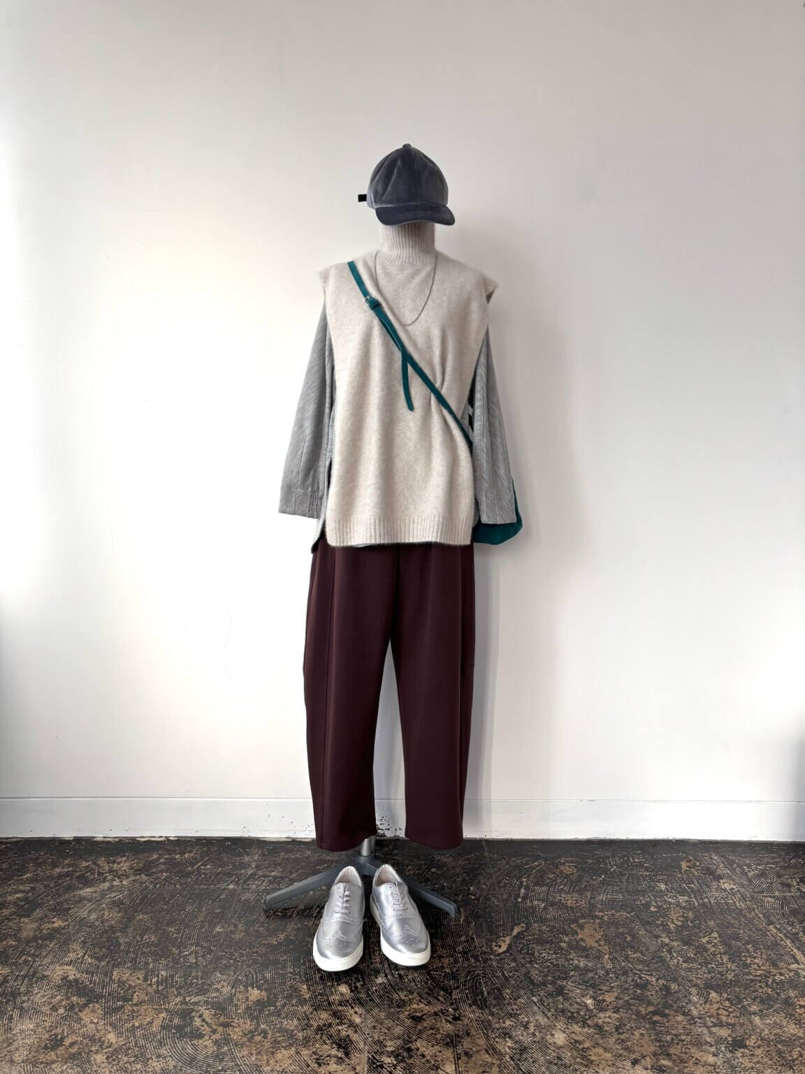 ベストやジレの中のインナーも手を抜かないのが着こなしのポイント、ダークブランウンとバニラホワイト相性は抜群 KEY:ベロア素材のキャップ