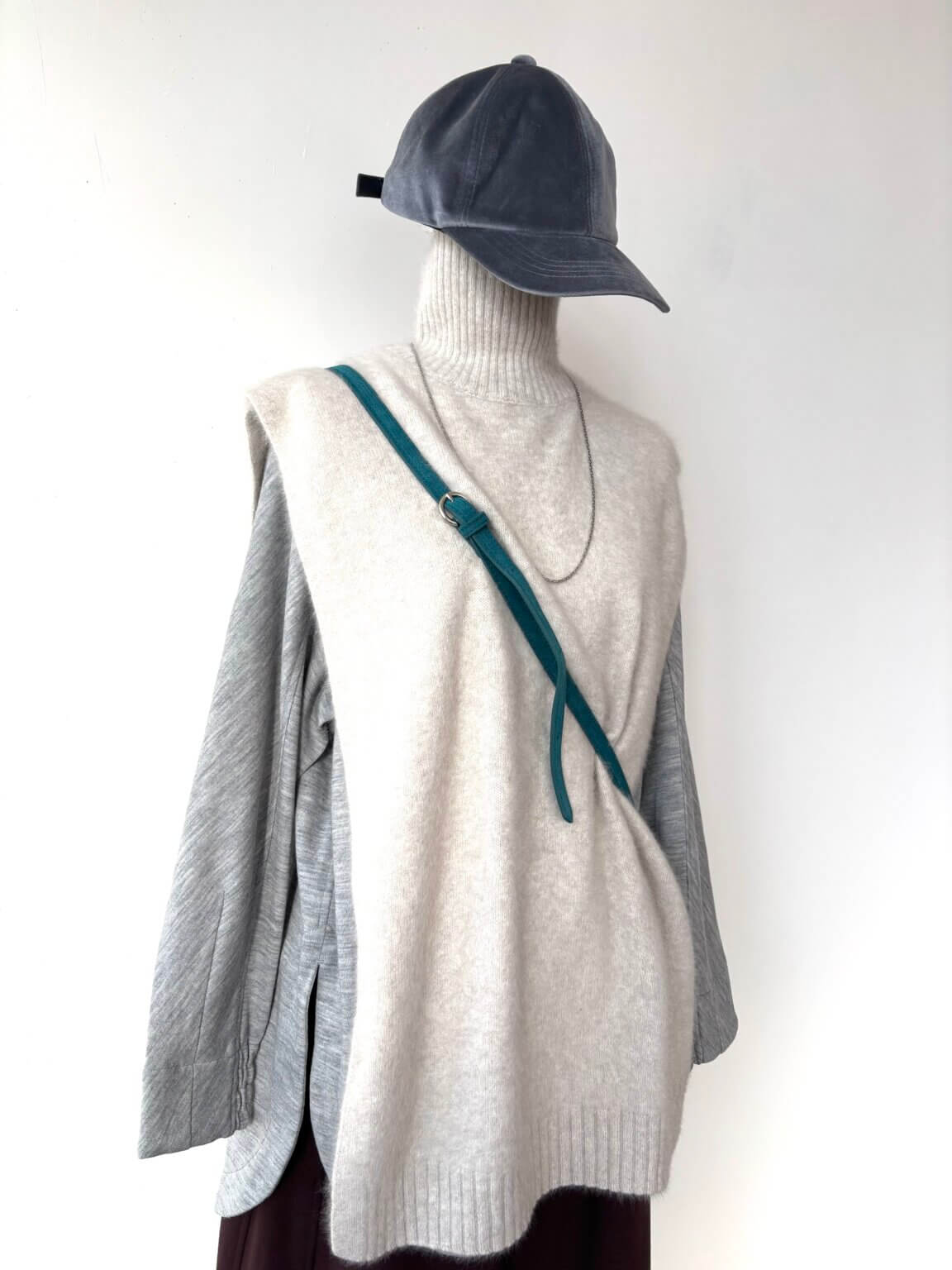 Cap ¥6490/High neck Knit ¥28600/Tops ¥19800/Pants ¥19580