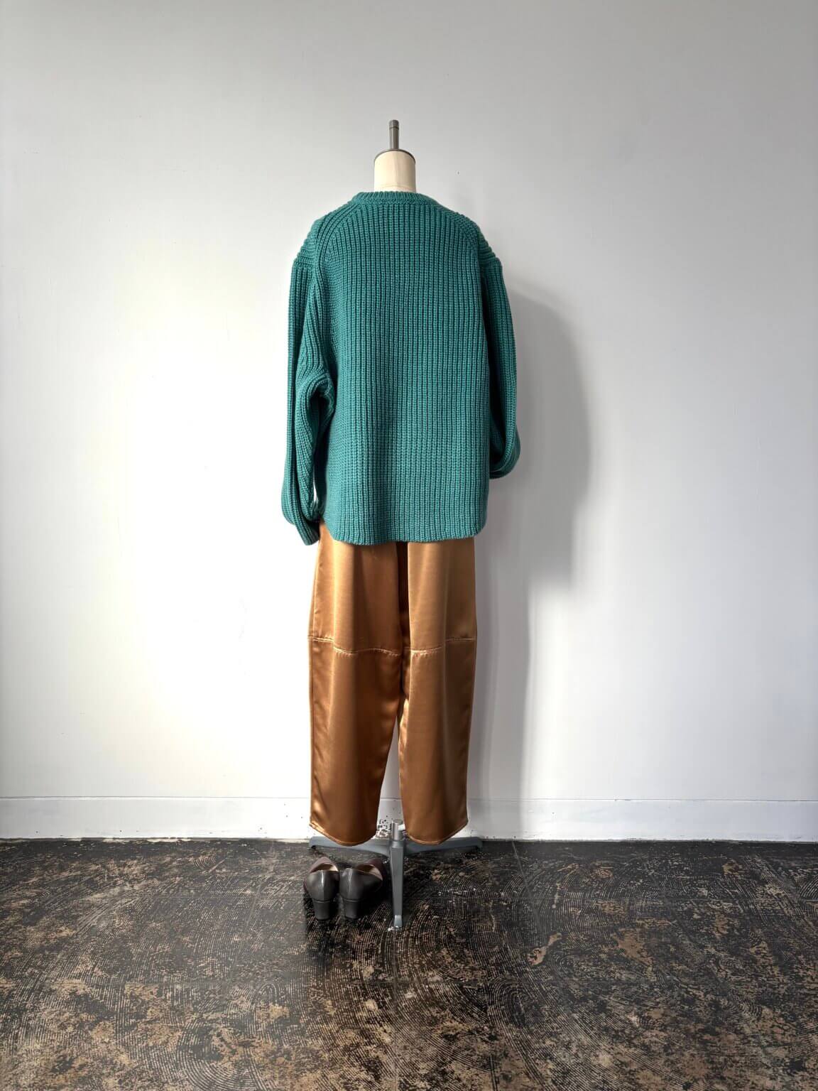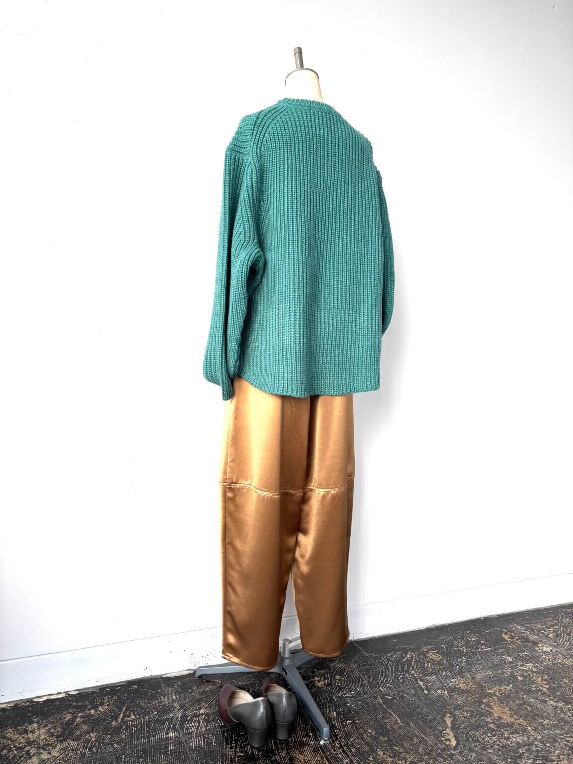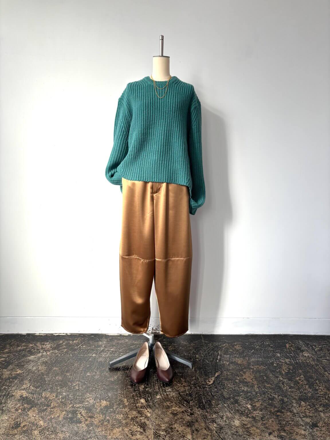 注目の素材 光沢のあるサテンアイテム!!光沢のあるアイテムにざっくりニットを合わせてカジュアル?キレイめ?どっち?が大人の装い KEY:ローゲージニット