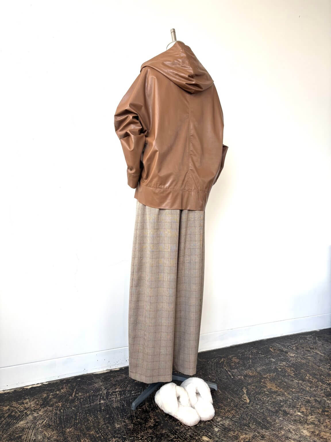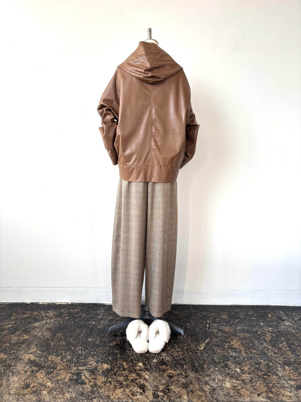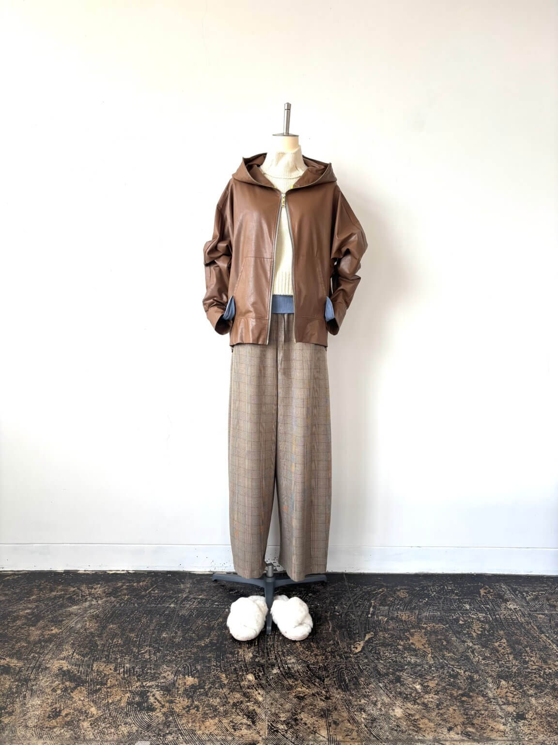 Fake leather Parker ¥37400/Knit ¥24200/Check pants ¥18480