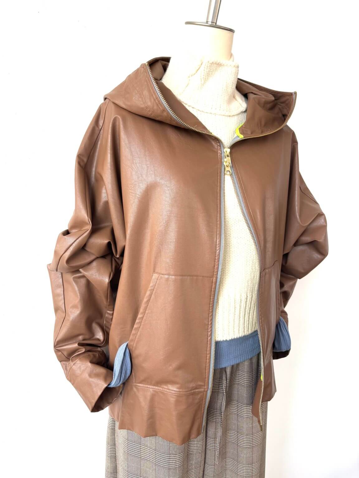 シープレザーのキャメル色パーカーは季節の変わり目に重宝する長季節のマイワードローブに君臨するアイテム。KEY:インナーのオフホワイトとスモーキーブルー
