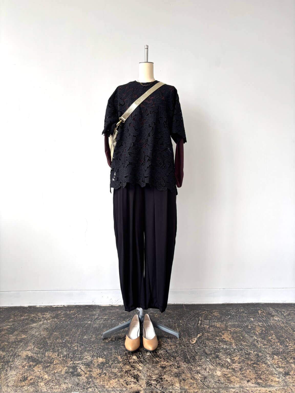 Lace Tops ¥24200/Volume pants ¥18700/T shirt ¥9350/Pumps ¥35200/Bag ¥40700