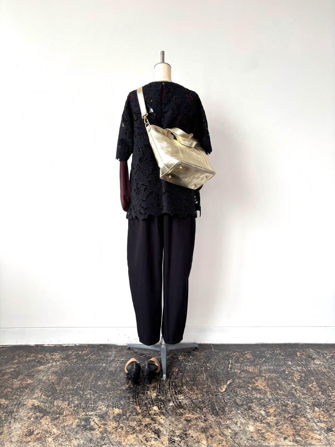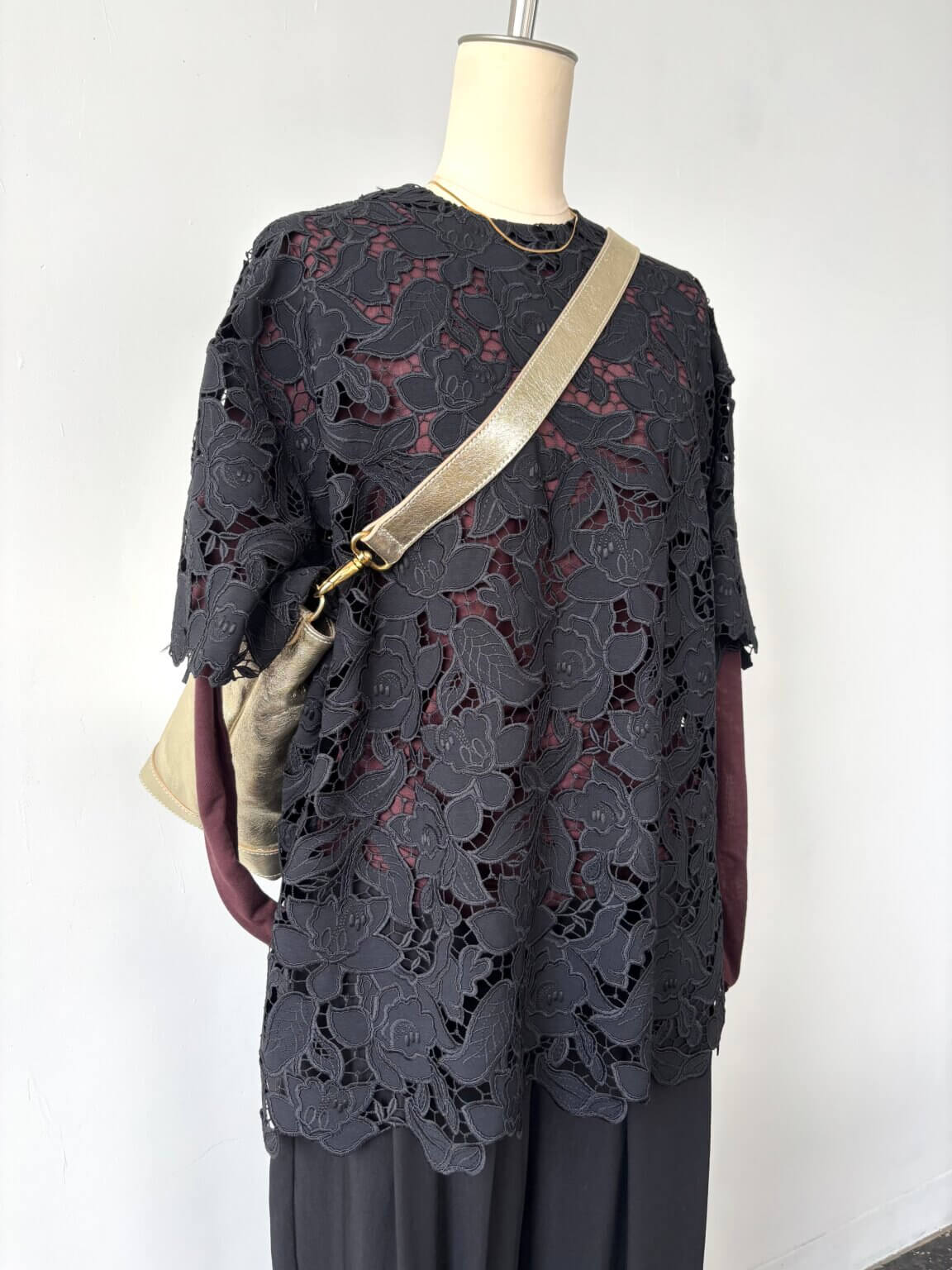 フォーマルできたお洋服をカジュアルダウンさせる・・華やかなレースのトップスに個性的なサルエル風シルエットのパンツを合わせて。KEY:インナーのダークブラウン
