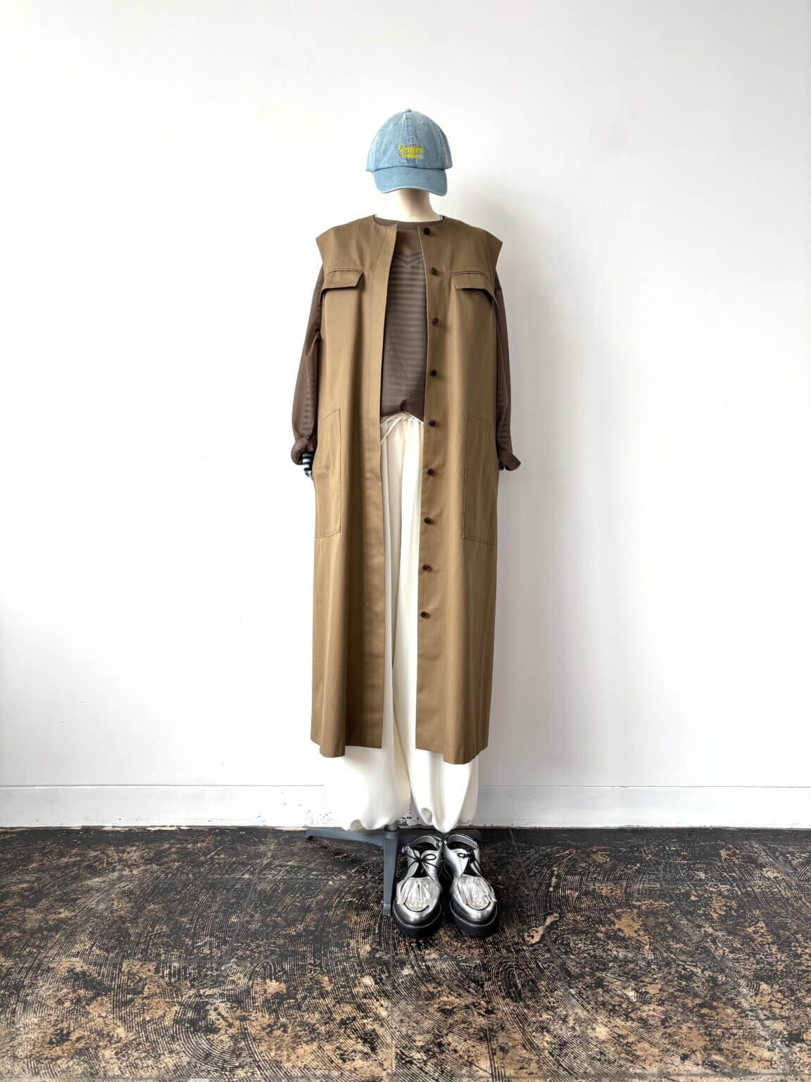 Cap ¥6930/Gilet ¥27500/Sheer Tops ¥9790/boarder T shirt ¥7590/Pants ¥17930