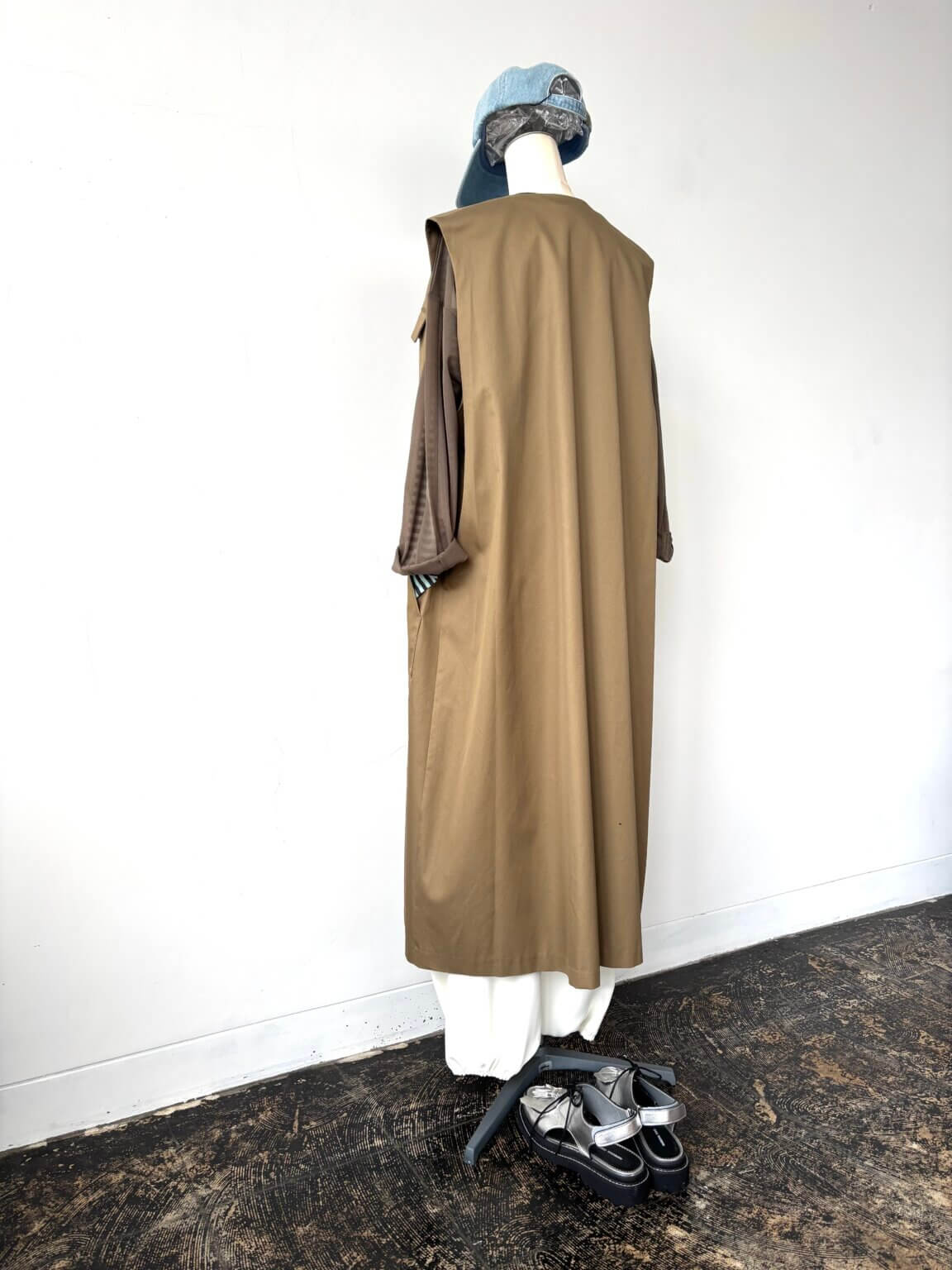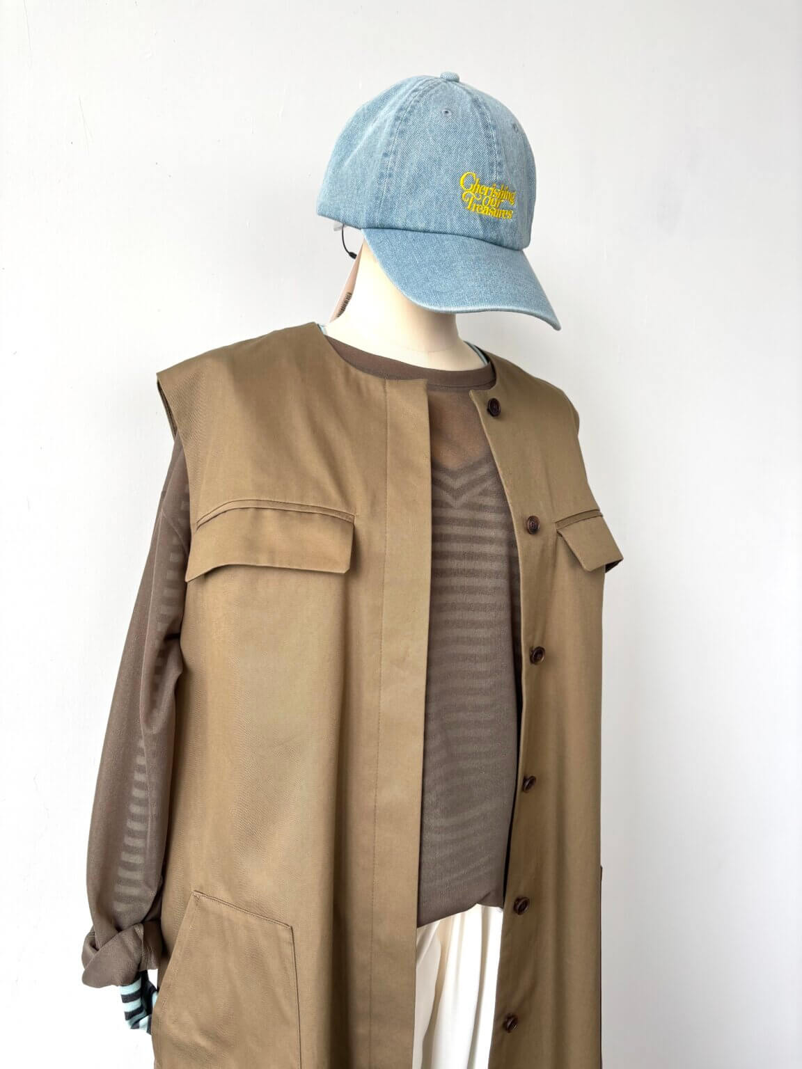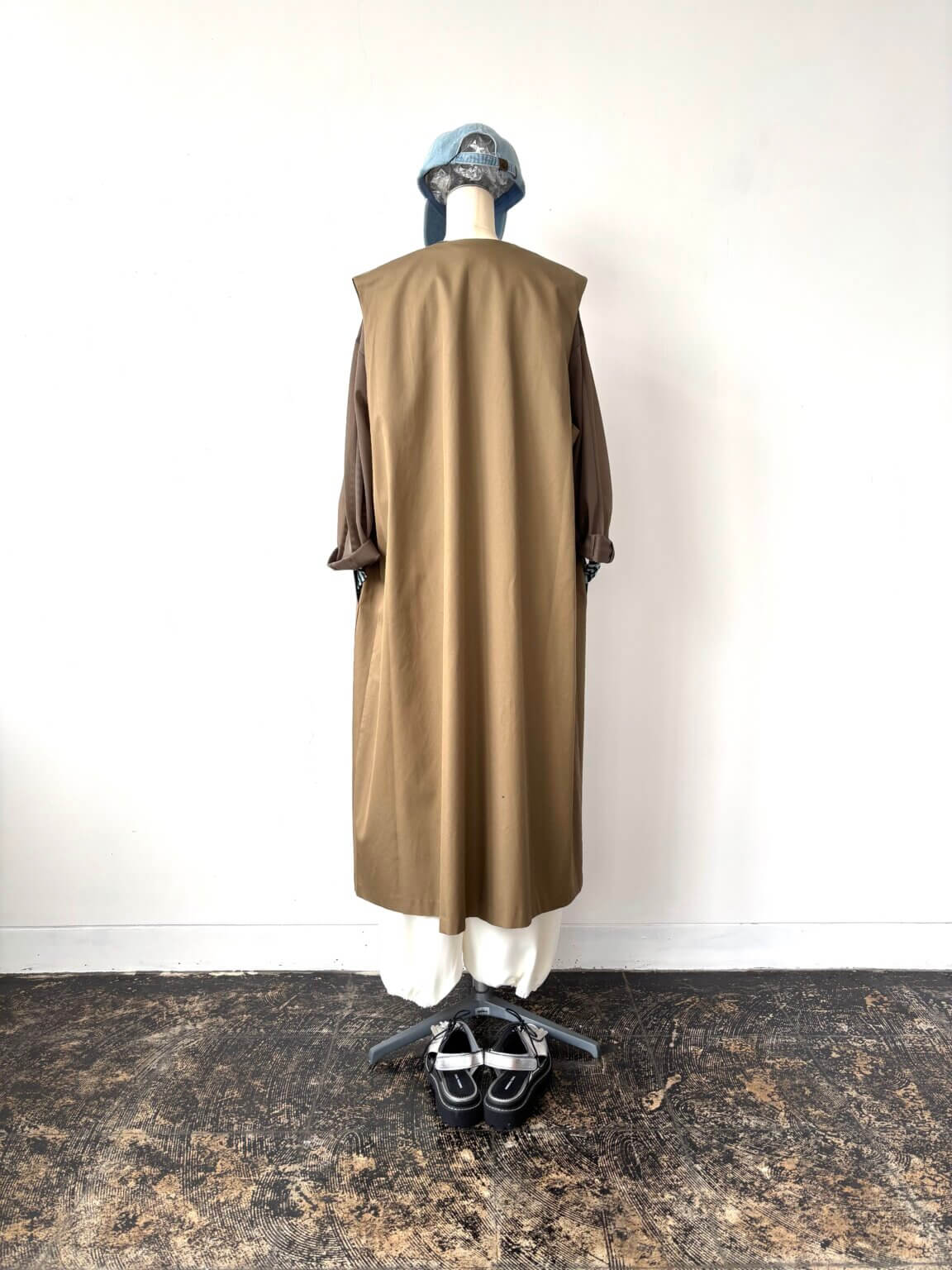 ワンピースジレをジレ使いしてベージュ×ホワイト×ライトブルーのバランスの取り入れやすいカラー合わせ。KEY:インナーの色