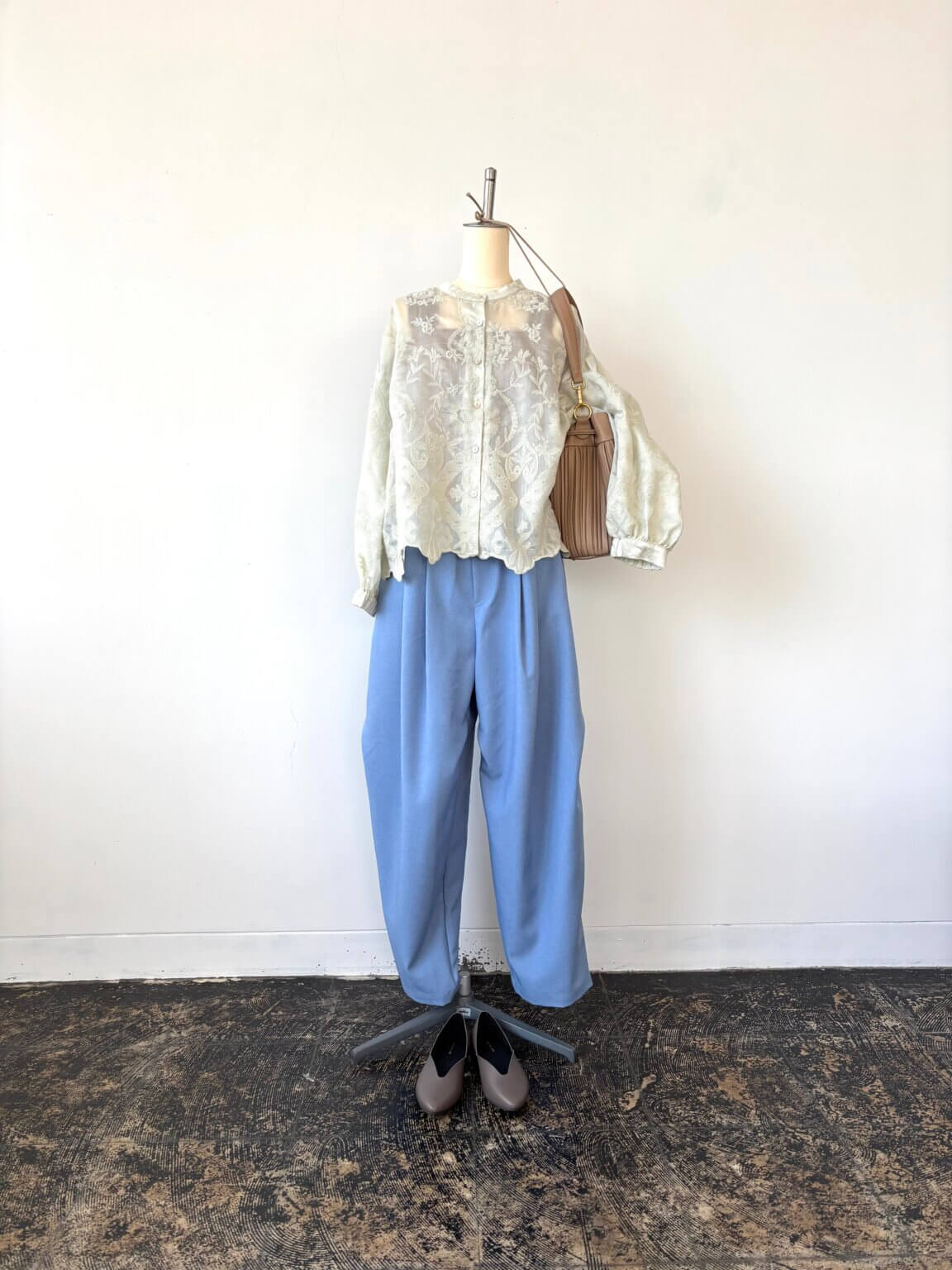 Embroidery blouse ¥16500/Pants ¥17380/Bag ¥35200/Pumps ¥29000