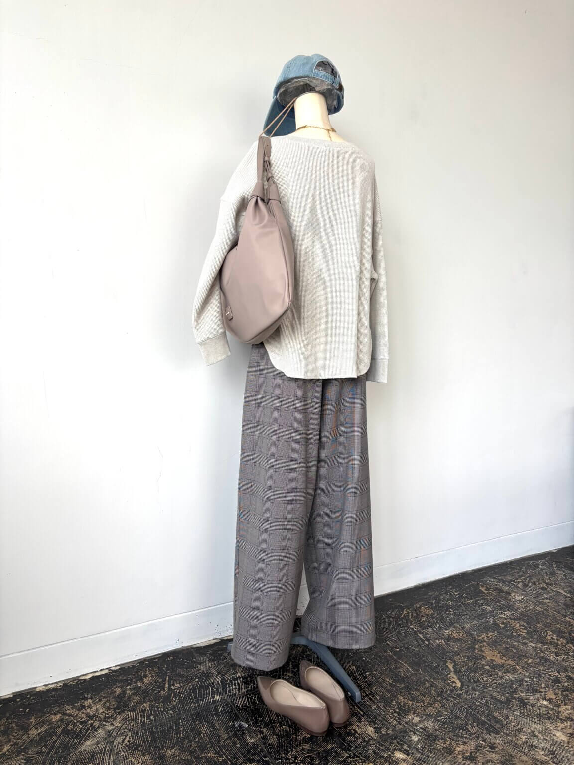 Cap ¥6930/Waffle T shirt ¥13200/Check pants ¥24200/Bag ¥34300