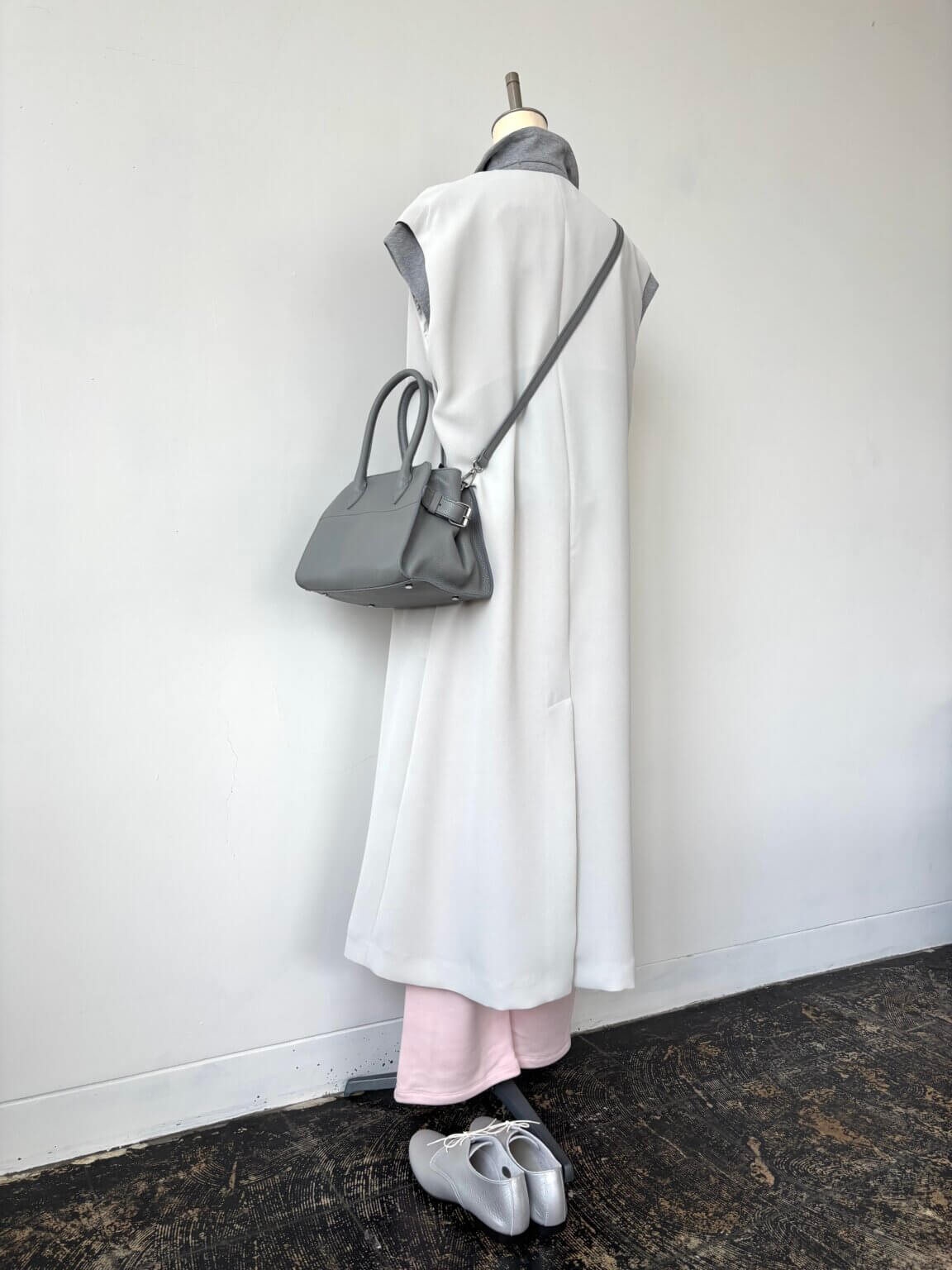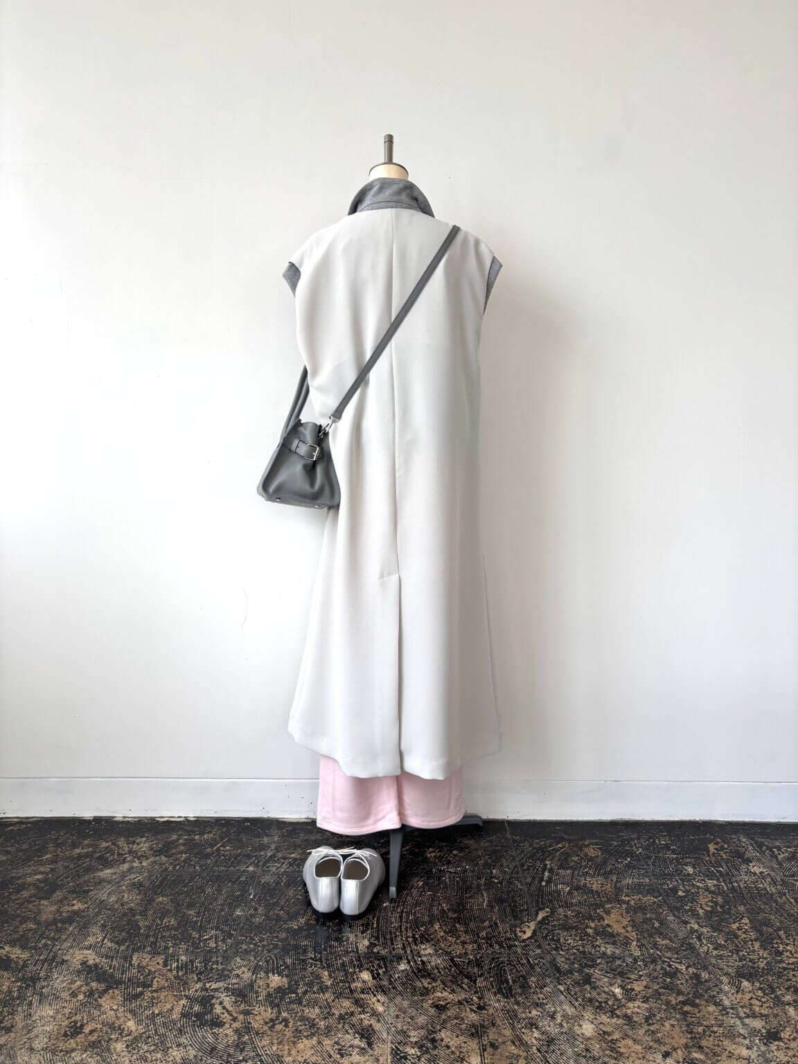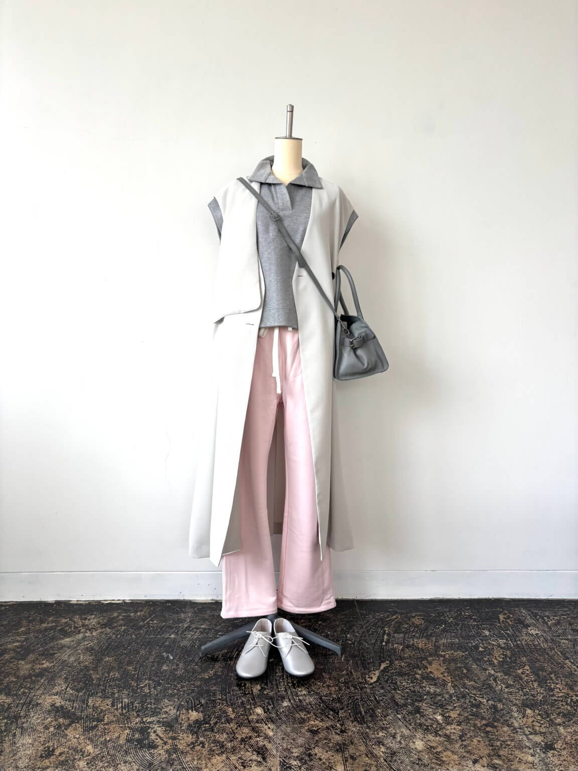春はやっぱりパステルな気分 淡いピンク×ライトグレー鉄板配色を着こなしに取り入れて春の装い。KEY:クリームのロングジレ