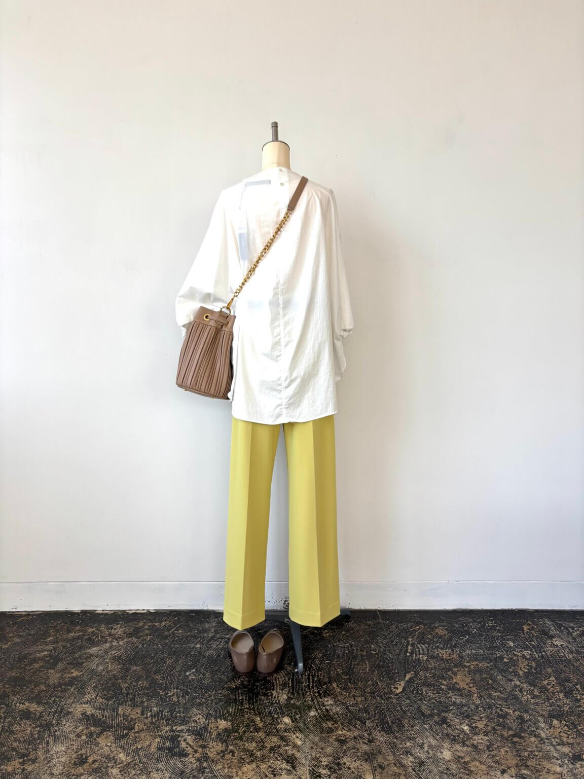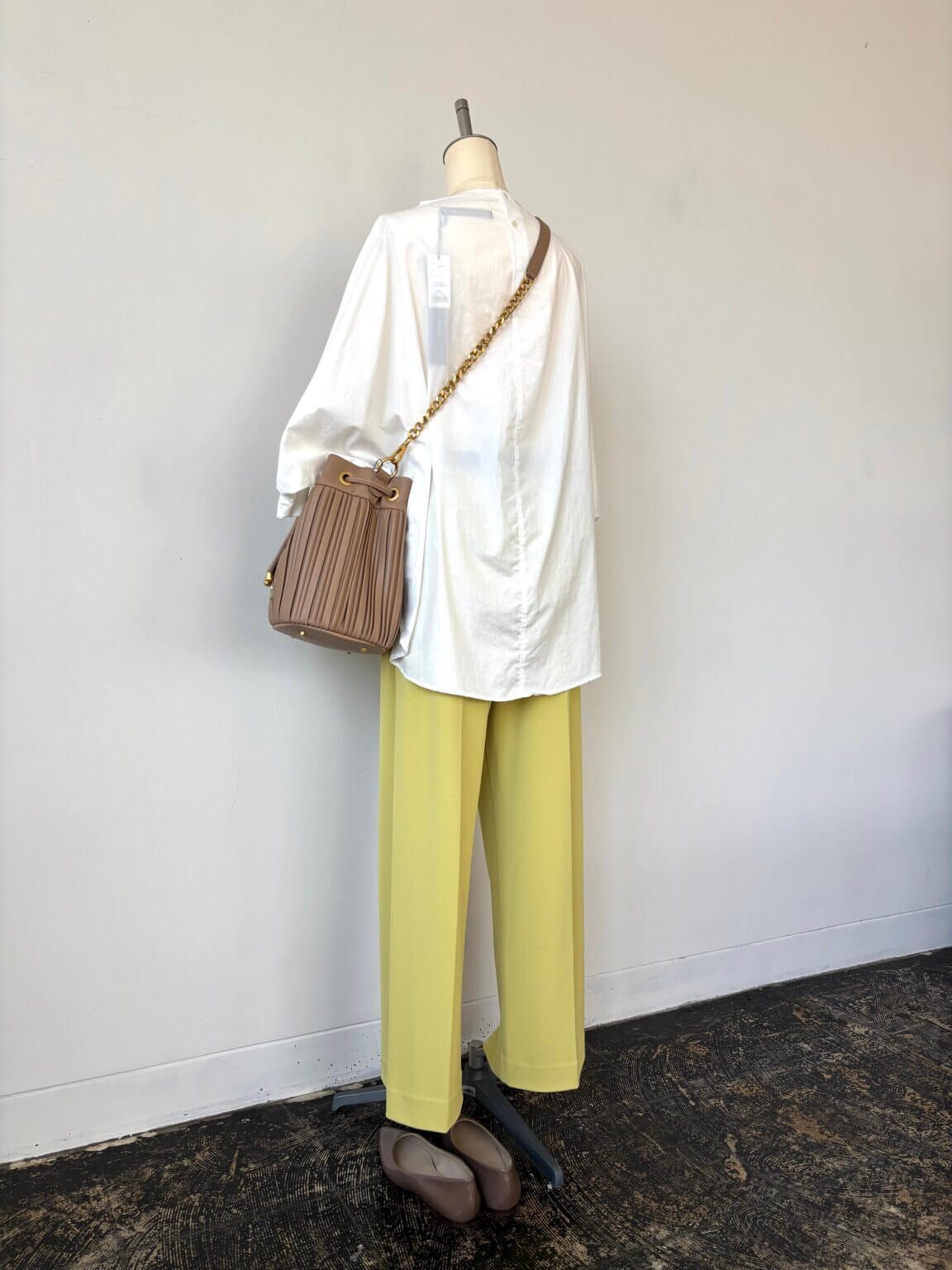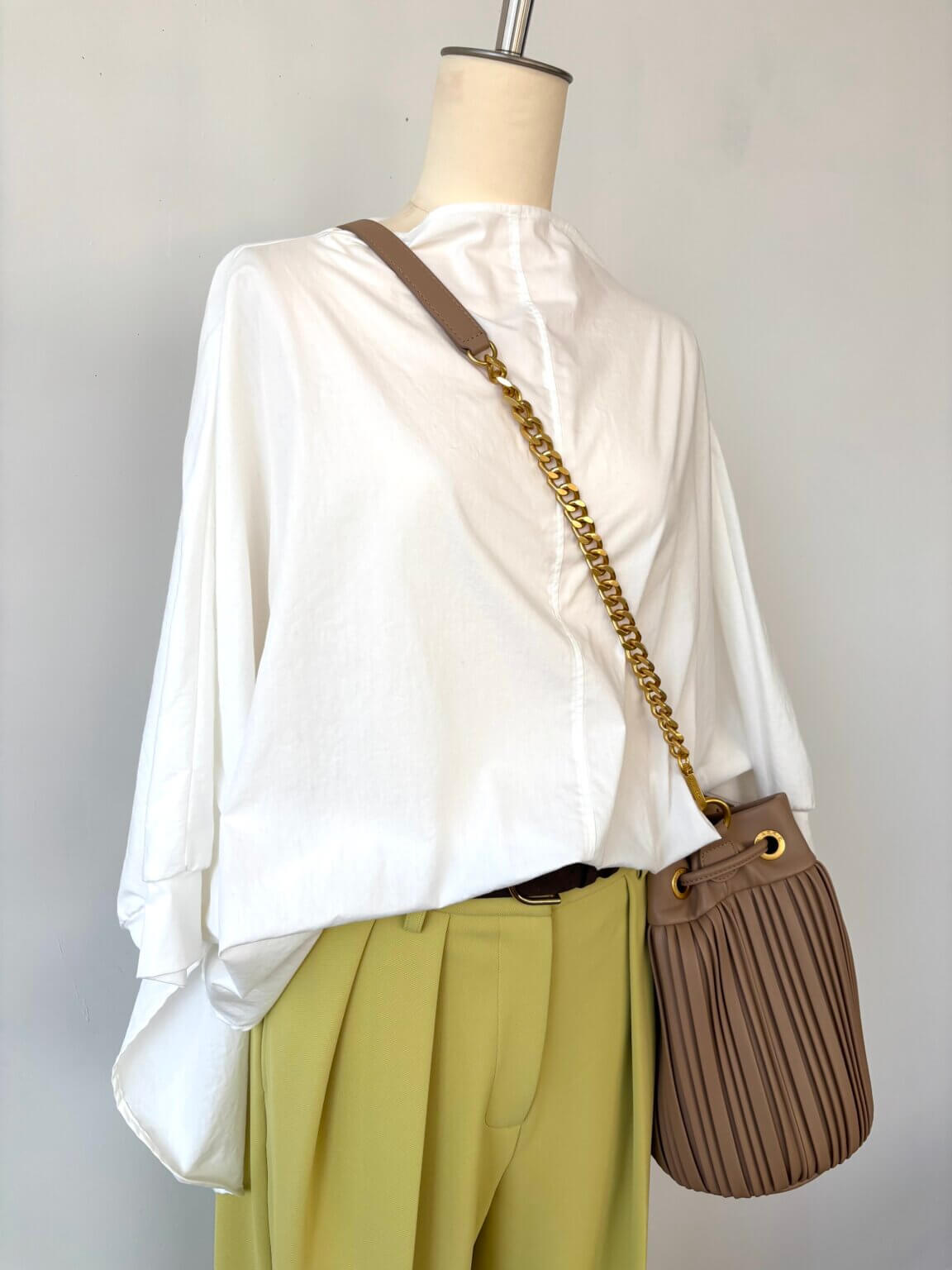 Dolman sleeve blouse ¥12980/Pants ¥17600/Bag ¥35200