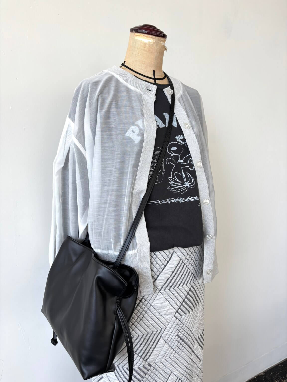 ホワイト×チャコールグレー 透け感のカーディガンにあえてキッチュなキャラクターTシャツを!大人の遊び心やオチャメさにセンスがキラリ!! KEY:レザーの小物