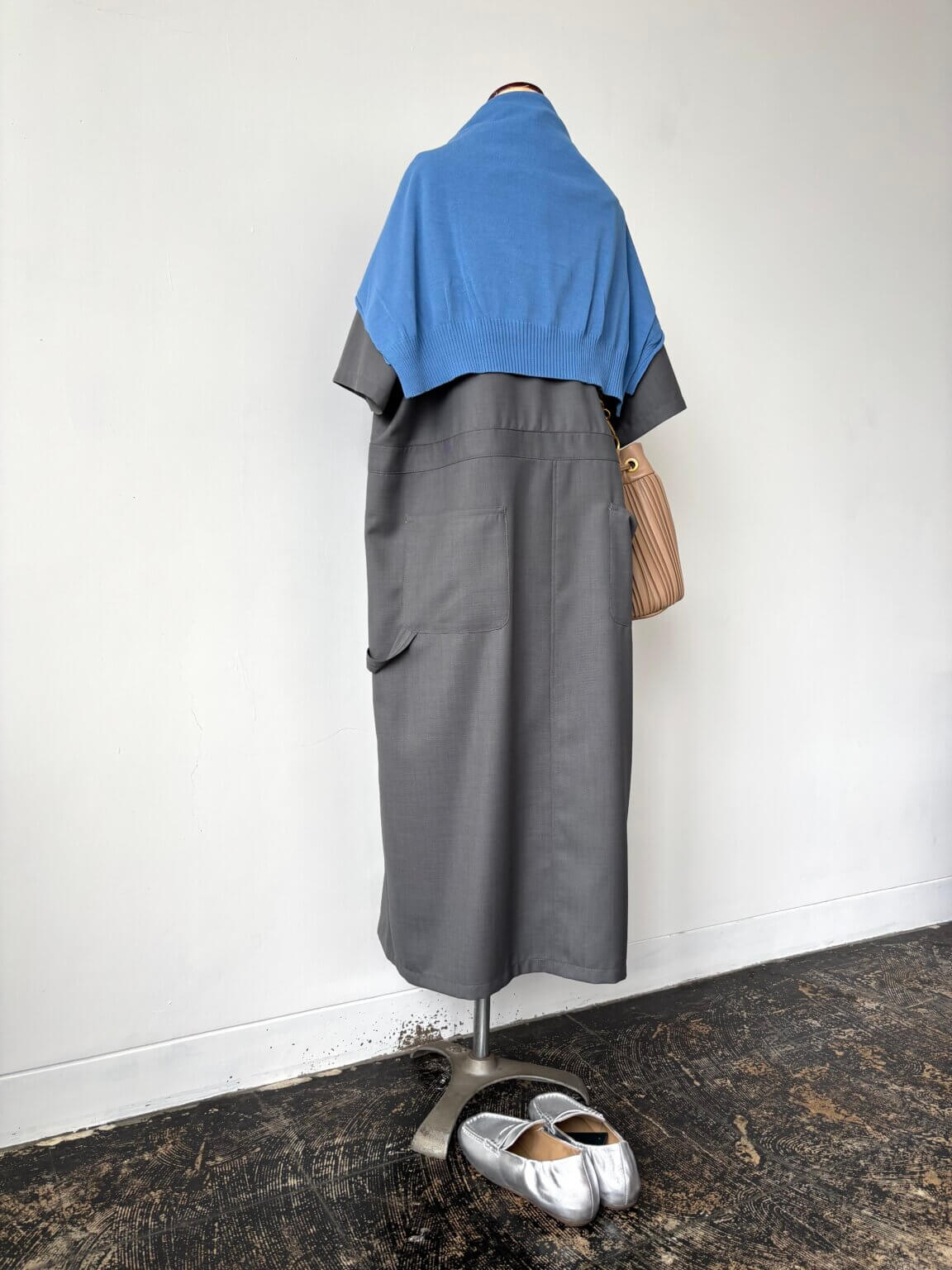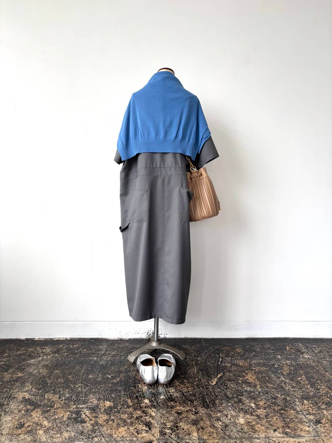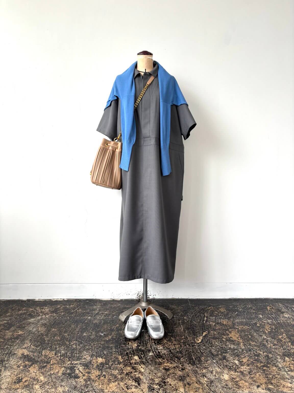 ワンピースコーディネイトは自分らしさを小物(バッグや靴)で雰囲気を作りましょう。KEY:スニーカーからアップデートシルバーのメタリックローファー